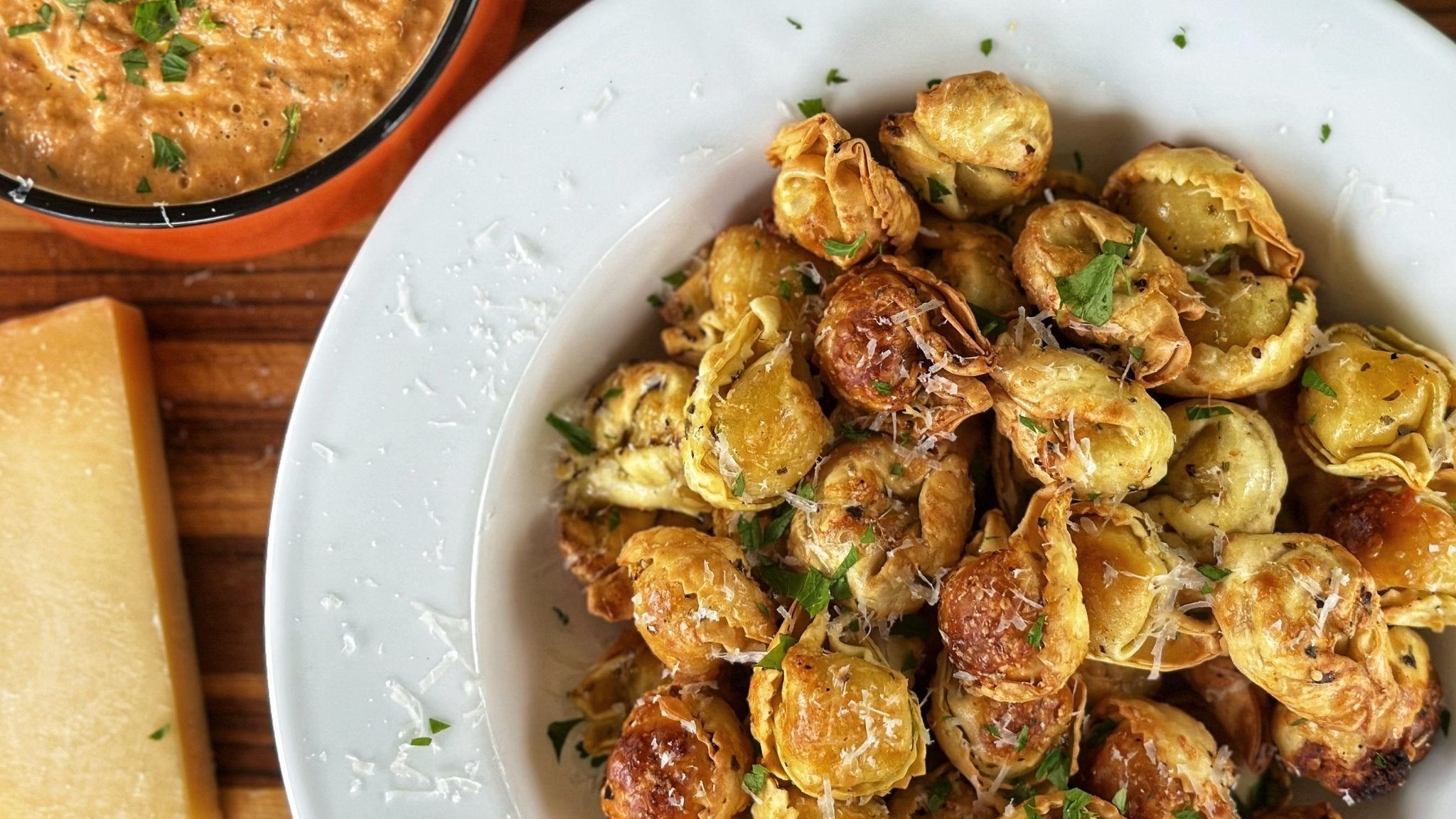 - Transfer the seasoned tortellini to the air fryer basket. Cook for 15 to 17 minutes, shaking the basket every 5 minutes for even crisping. The tortellini are done when they’re deeply golden and crispy. Transfer them to a serving platter and garnish with additional Parmesan cheese and chopped parsley, if using.