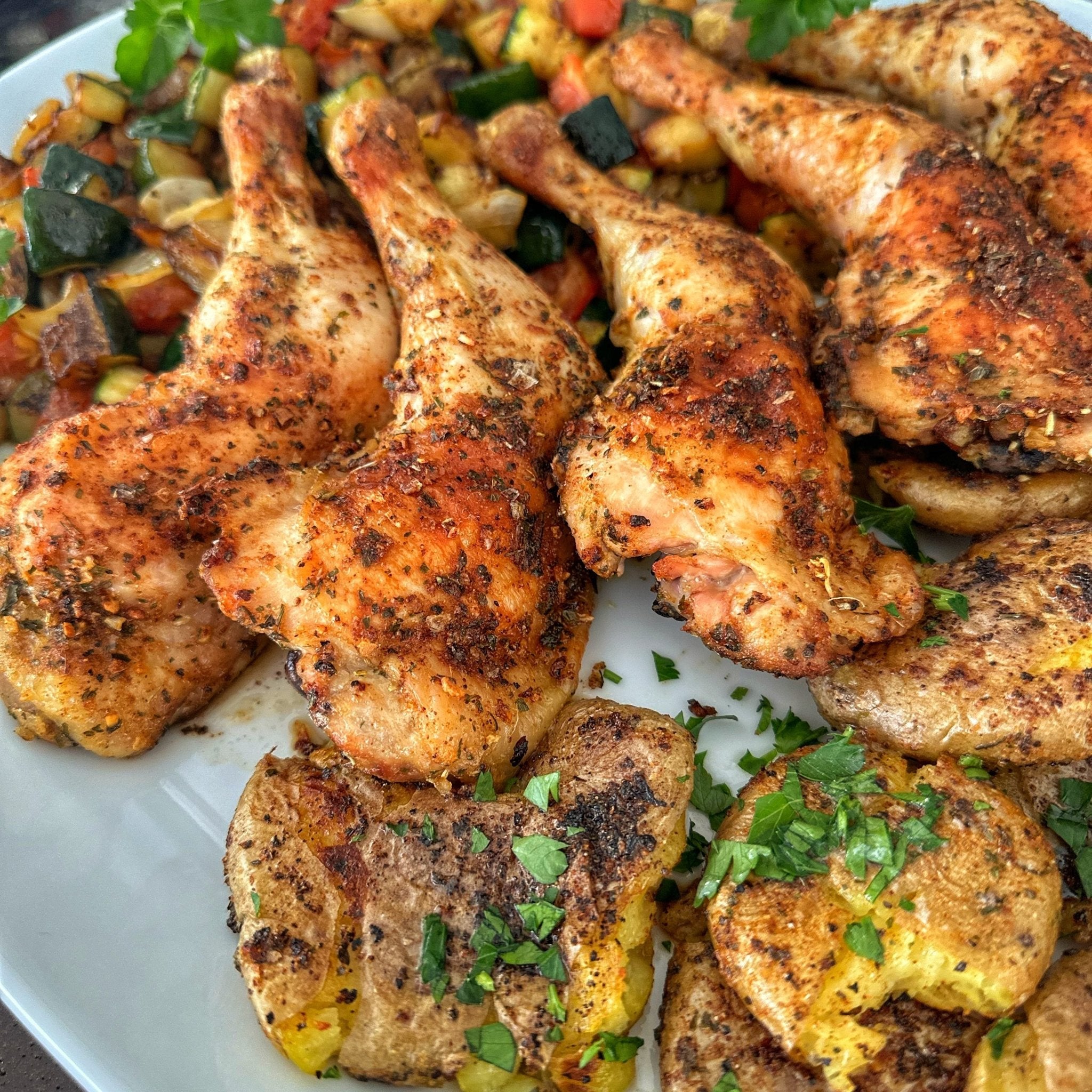 Meanwhile, preheat the Blackstone Airfryer to 400 degrees. Place the chicken in the airfryer and cook for 20-25 minutes, ensuring the chicken thighs reach 175 degrees.