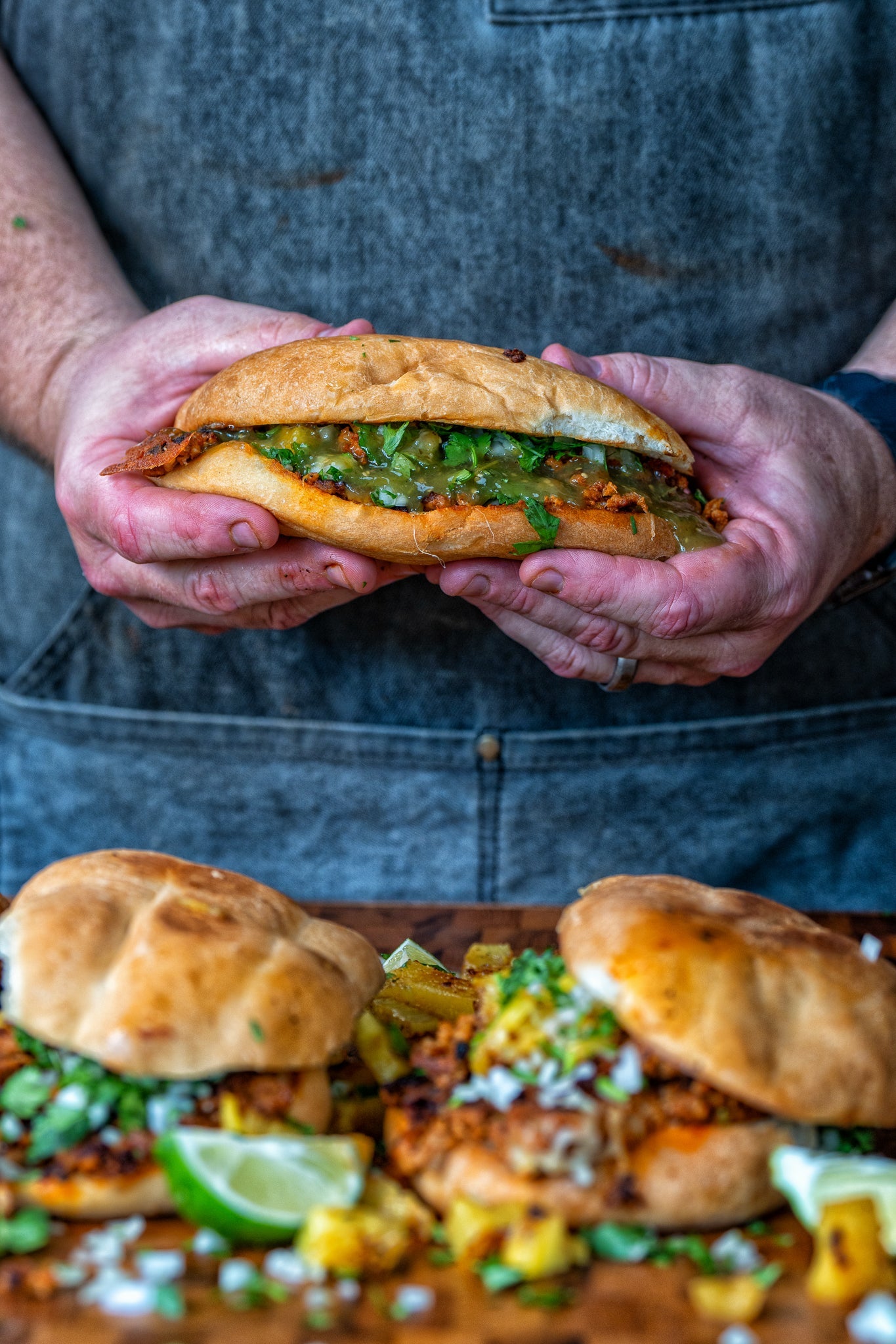 Add the chopped onions, cilantro, and Herdez Verde Salsa to complete your delicious Al Pastor Mexican Tortas.
