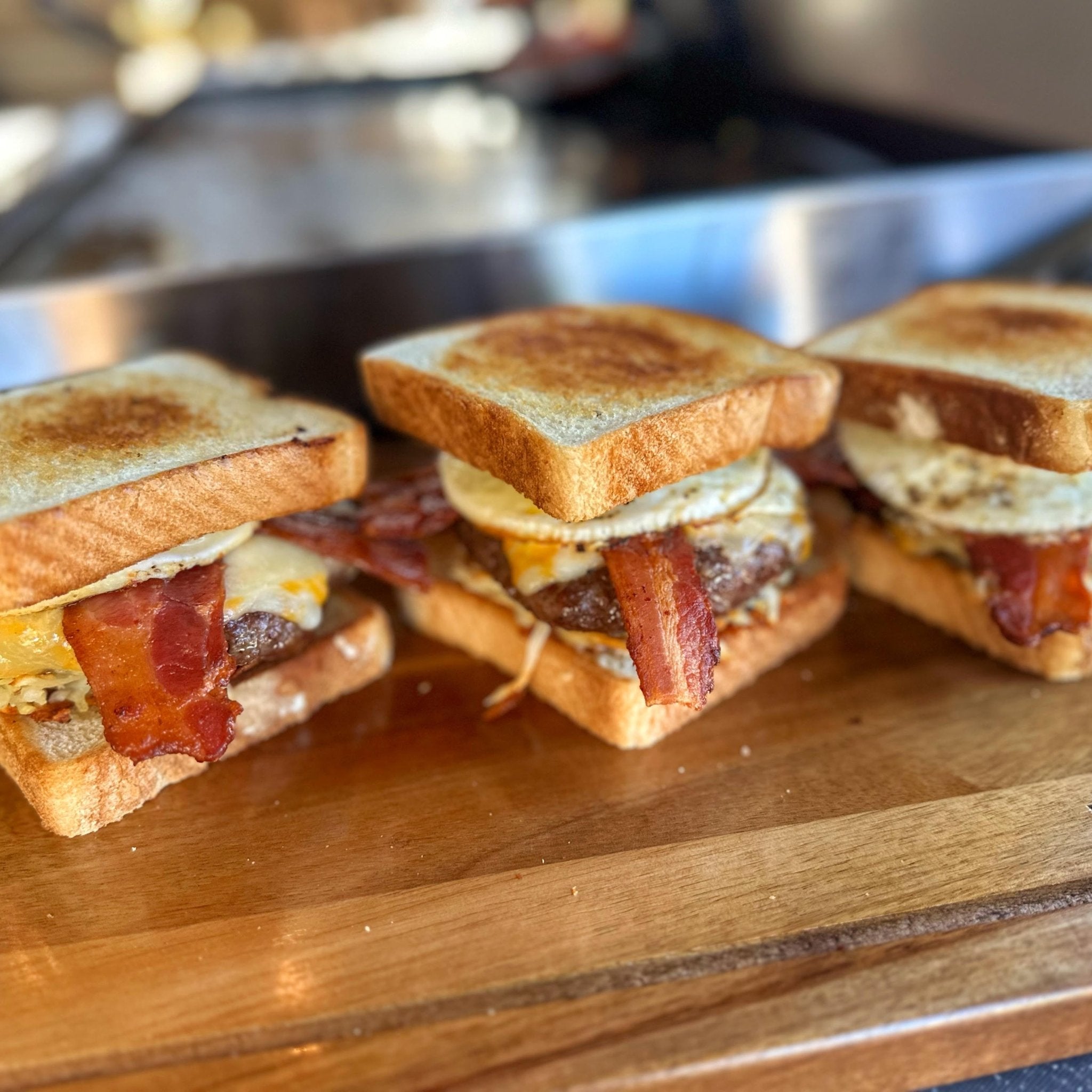 - Assemble each sandwich starting with the mayo side of the toast, then adding a hash brown patty, the sausage with melted cheese and bacon, a cooked egg, and finishing with the second slice of toast.