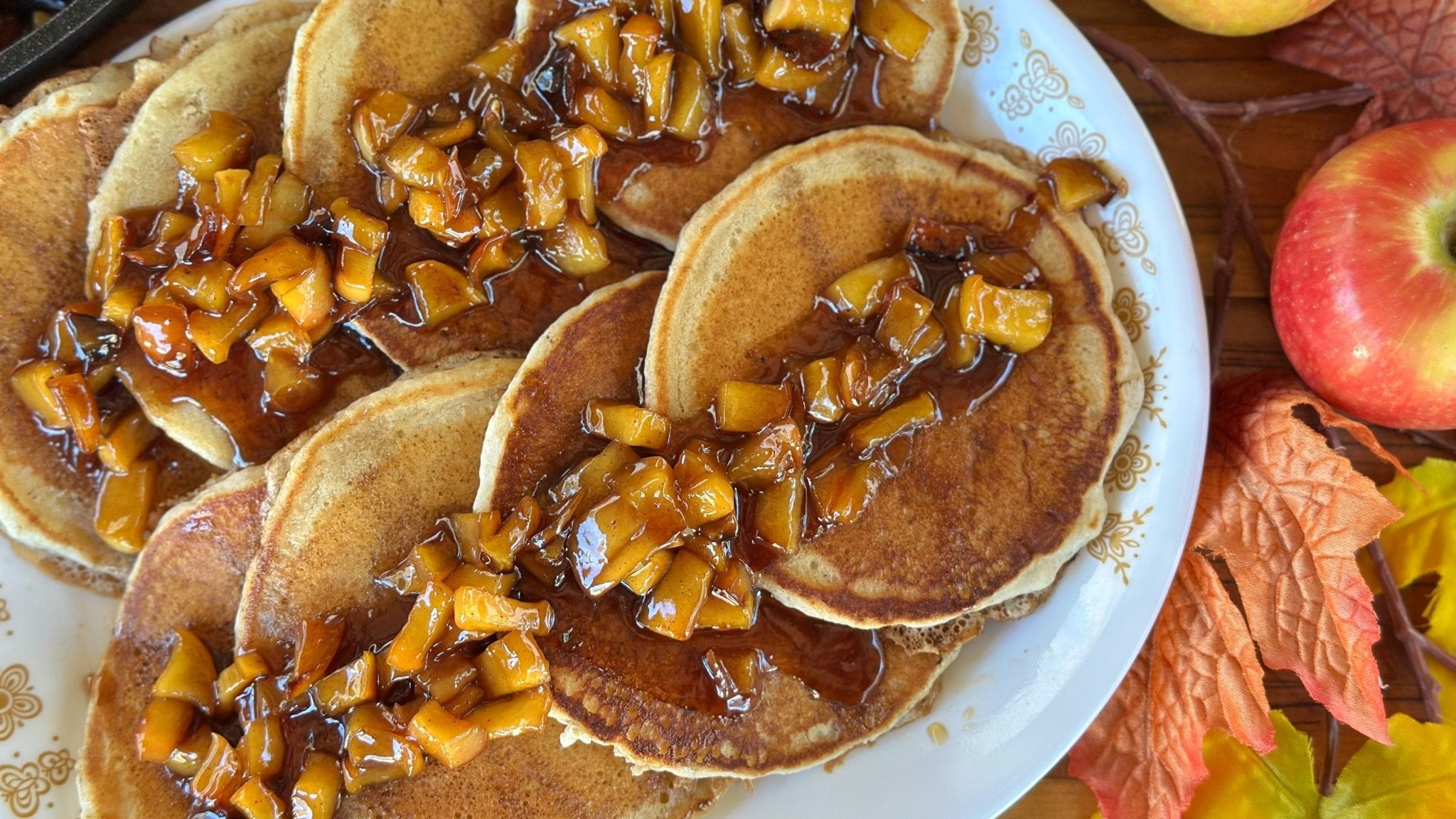 - To serve, stack the pancakes, spoon the warm apple pie topping over them, and drizzle with maple syrup.
