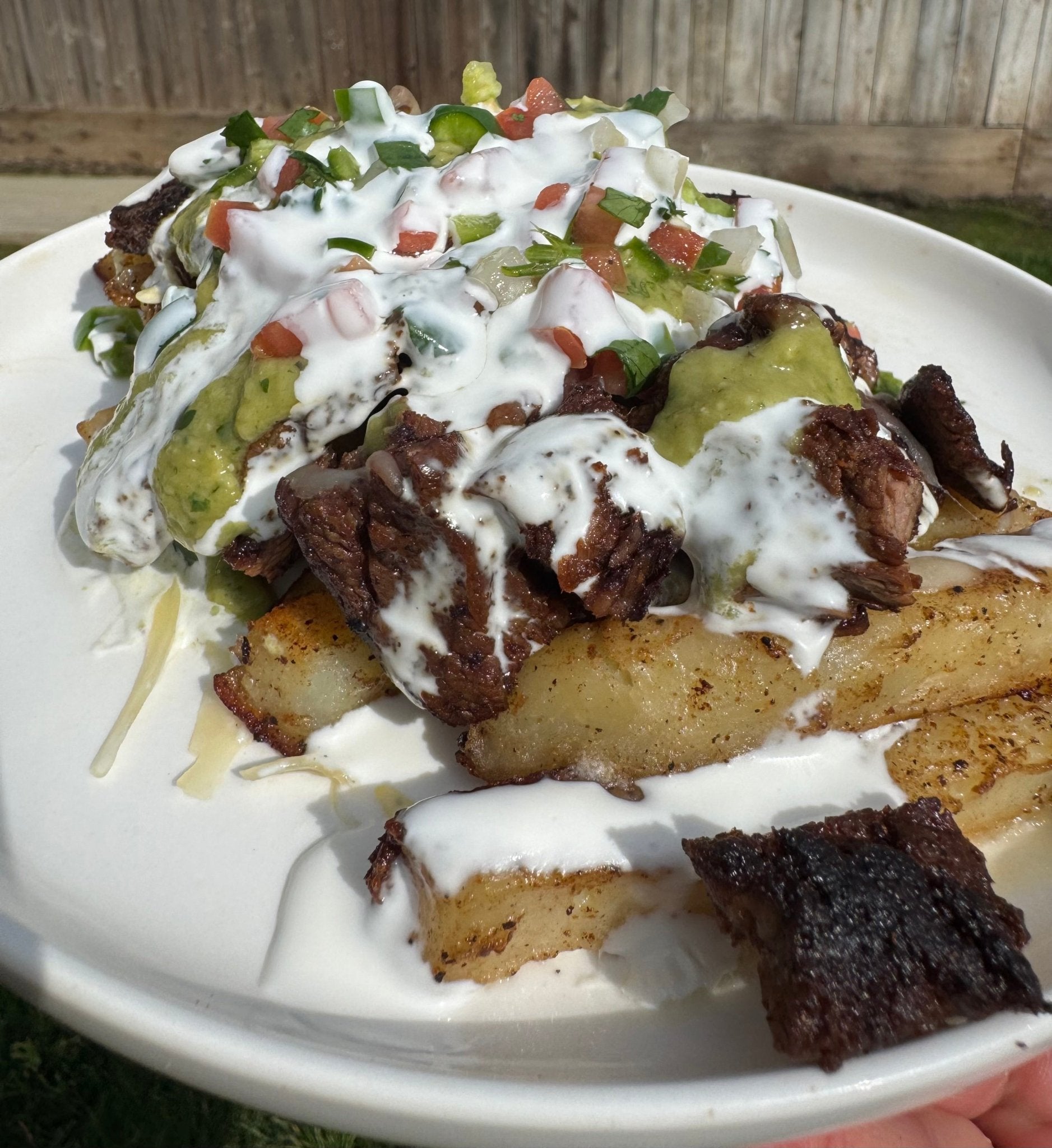 Serve fries on a plate, top with chopped carne asada, drizzle with avocado salsa, and add pico de gallo and sour cream.