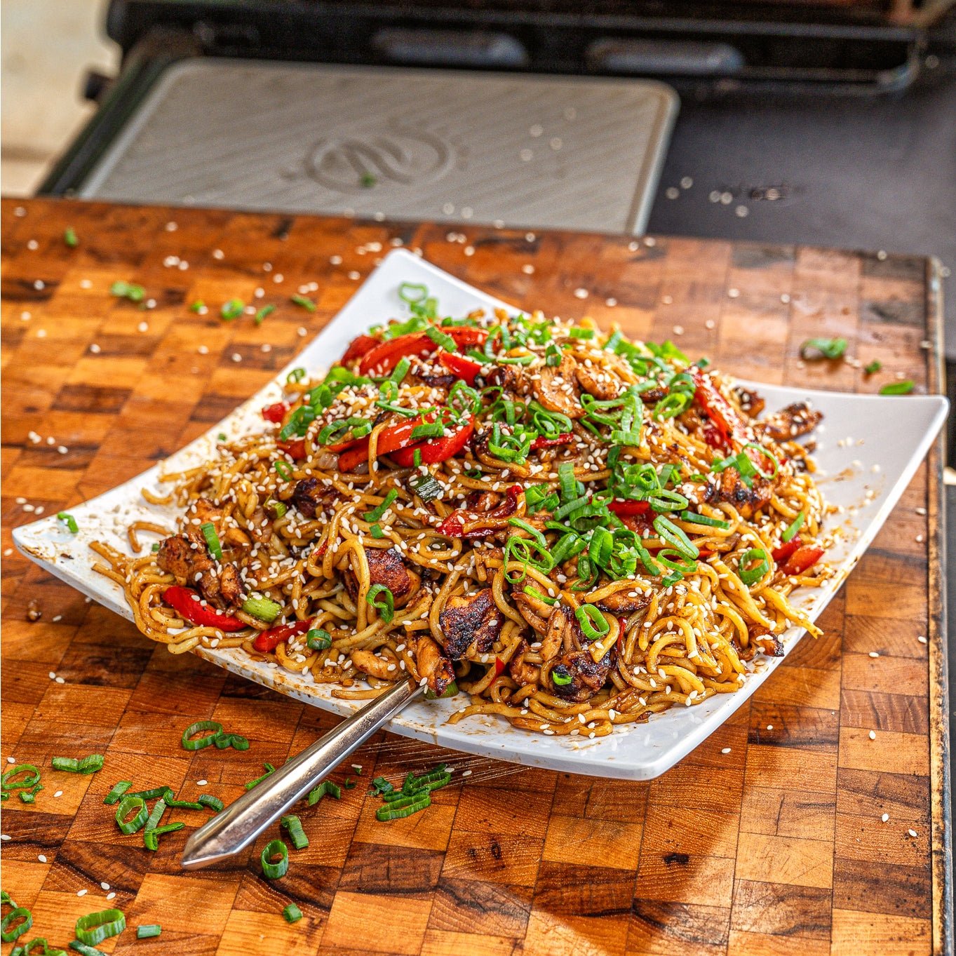 Combine the vegetables, noodles, and chicken on the griddle and mix well.