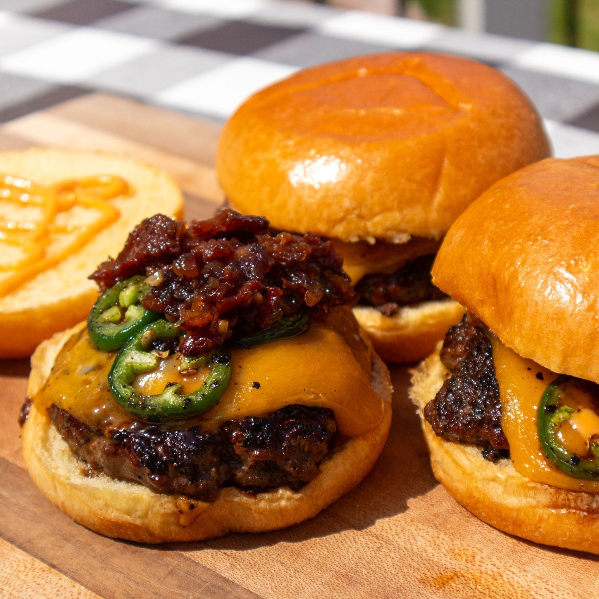 Top the burgers with toasted jalapenos, a generous spoonful of bacon jam, and a squirt of Burger Sauce.