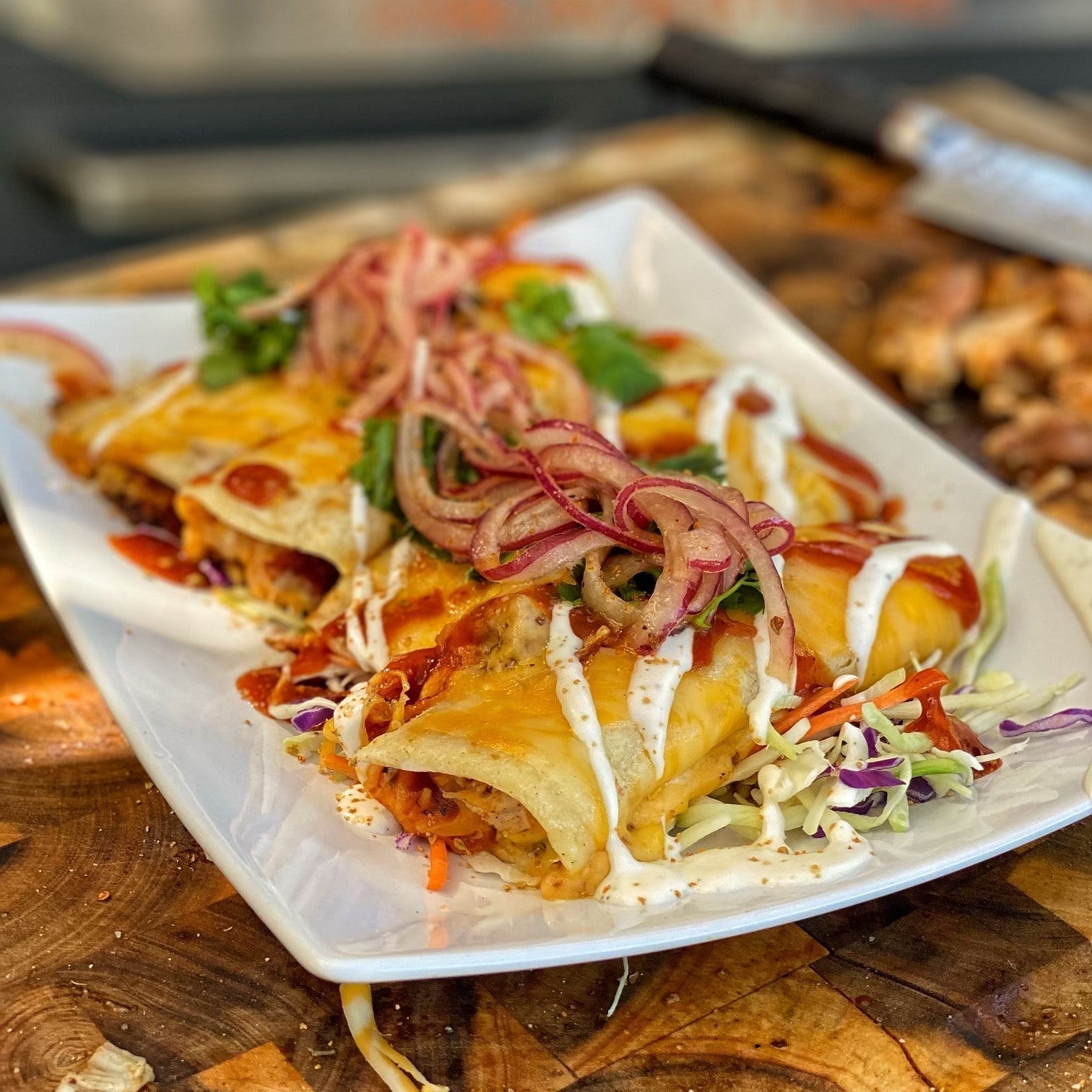 Once the cheese is melted, plate the enchiladas. Serve them over a bed of cabbage slaw, drizzle with some of the pickled onion vinegar, and garnish with chopped cilantro and pickled red onions. Finish with a drizzle of BBQ sauce, ranch dressing, and a sprinkle of Outlaw BBQ seasoning for extra flavor.