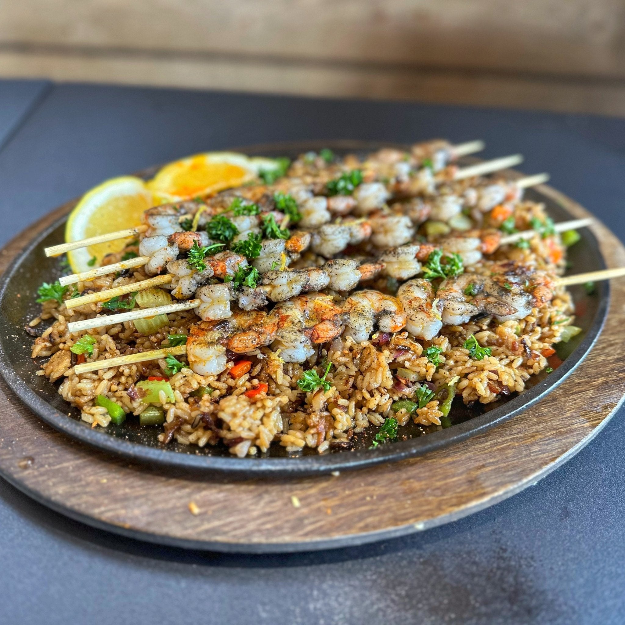 When the veggies are cooked, mix them with the rice. Remove from the griddle, top with the shrimp skewers, top with diced parsley, squeeze fresh lemon juice on top, and season with Blackstone's Cajun seasoning.
