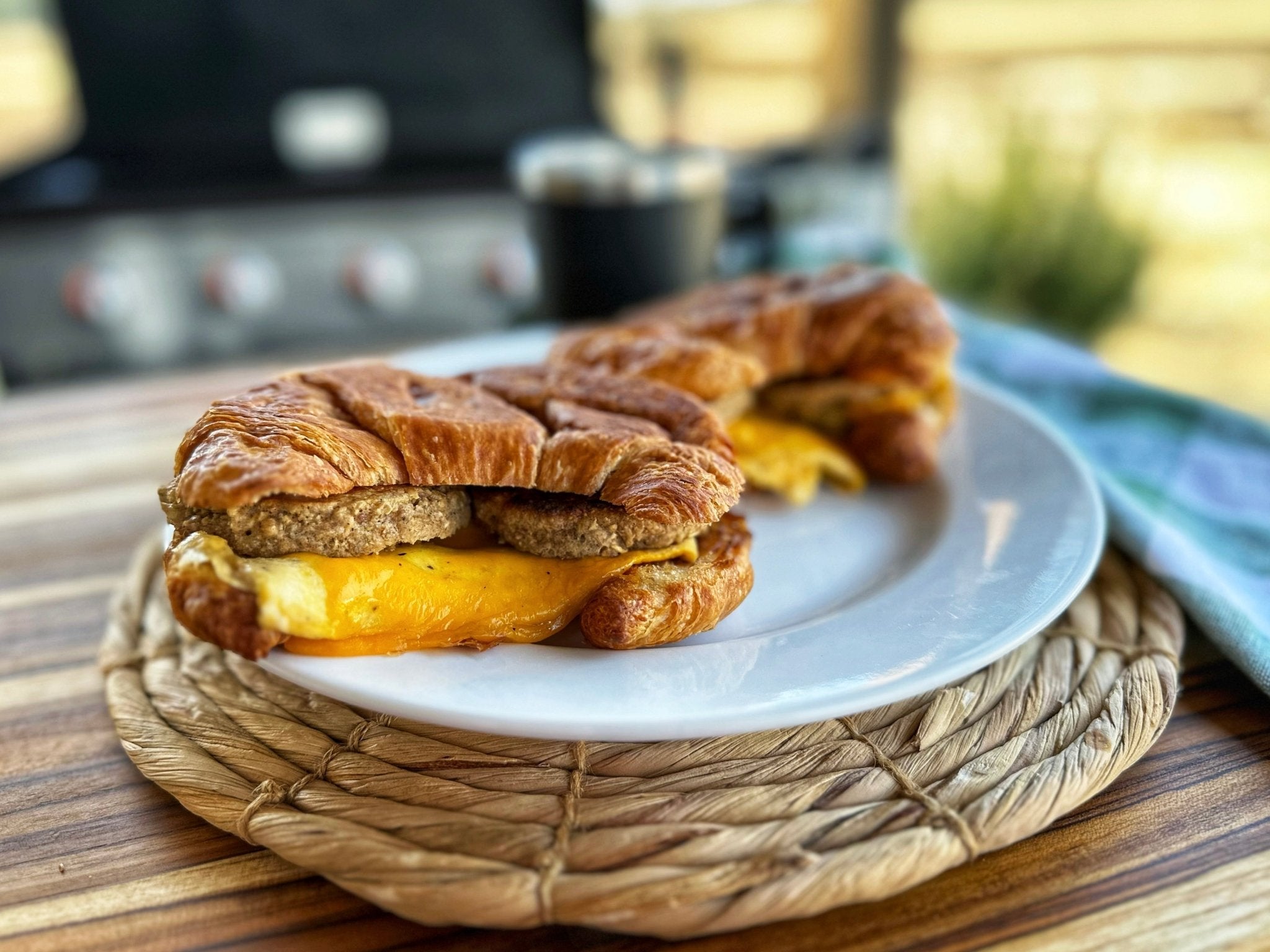 Scramble additional eggs on the griddle, top with cheese, and cover with a dome until the cheese has melted. Toast croissants on the griddle with butter. Cut each patty in half and assemble the sandwiches with croissants, eggs/cheese, and sausage. Enjoy!