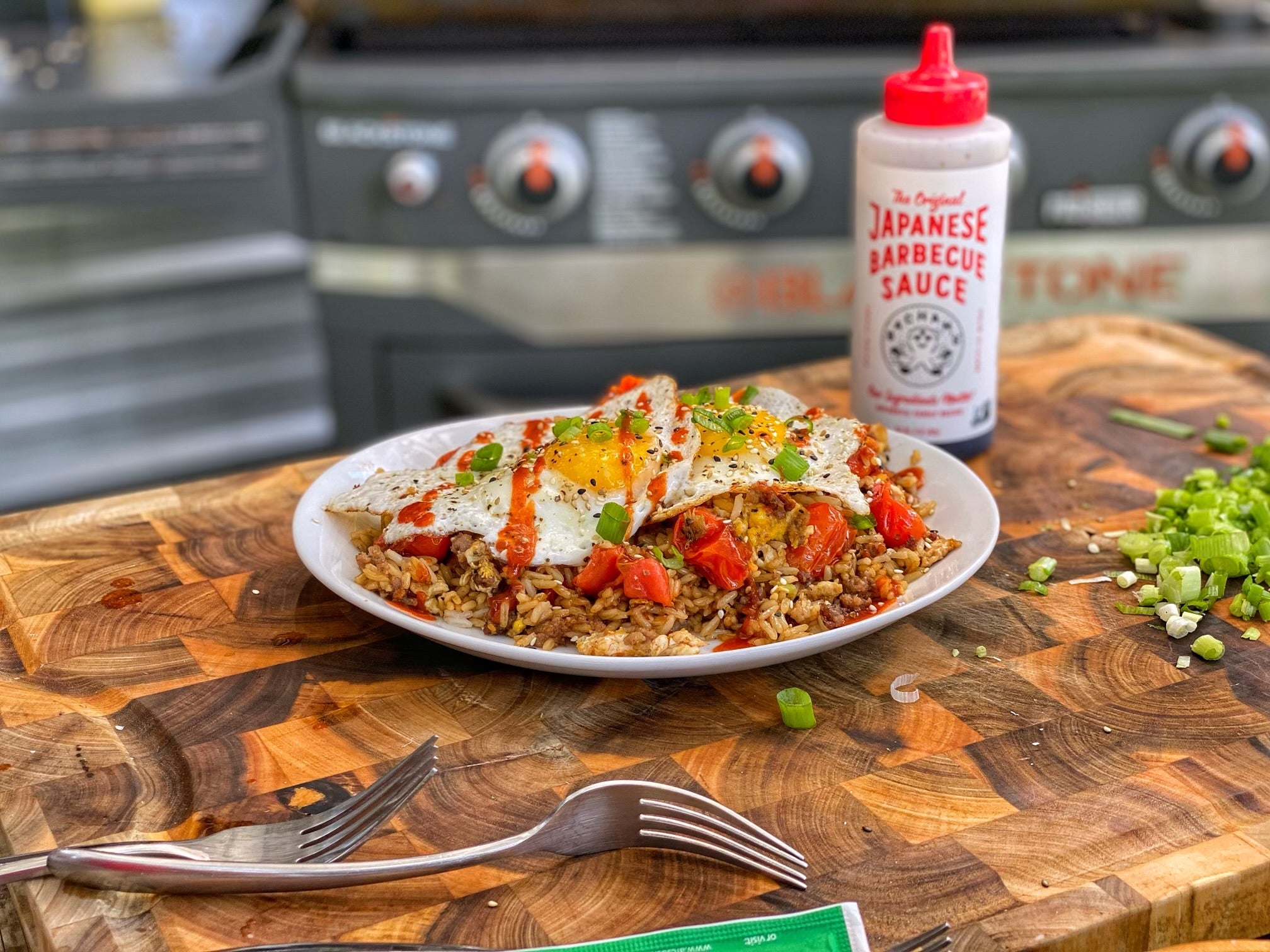 Slide the rice off to the cooler side of the griddle and cook two sunny-side-up eggs. Season with a little Blackstone SPG and cook until done.