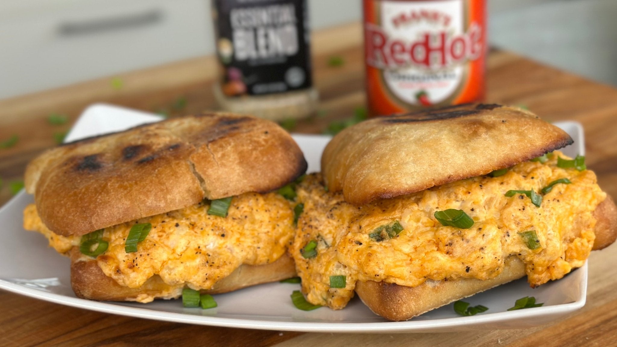 - Dip the cut sides of the ciabatta rolls into the remaining melted butter and place them on a pan. Spoon a generous amount of the buffalo chickpea mixture onto the bottom halves.