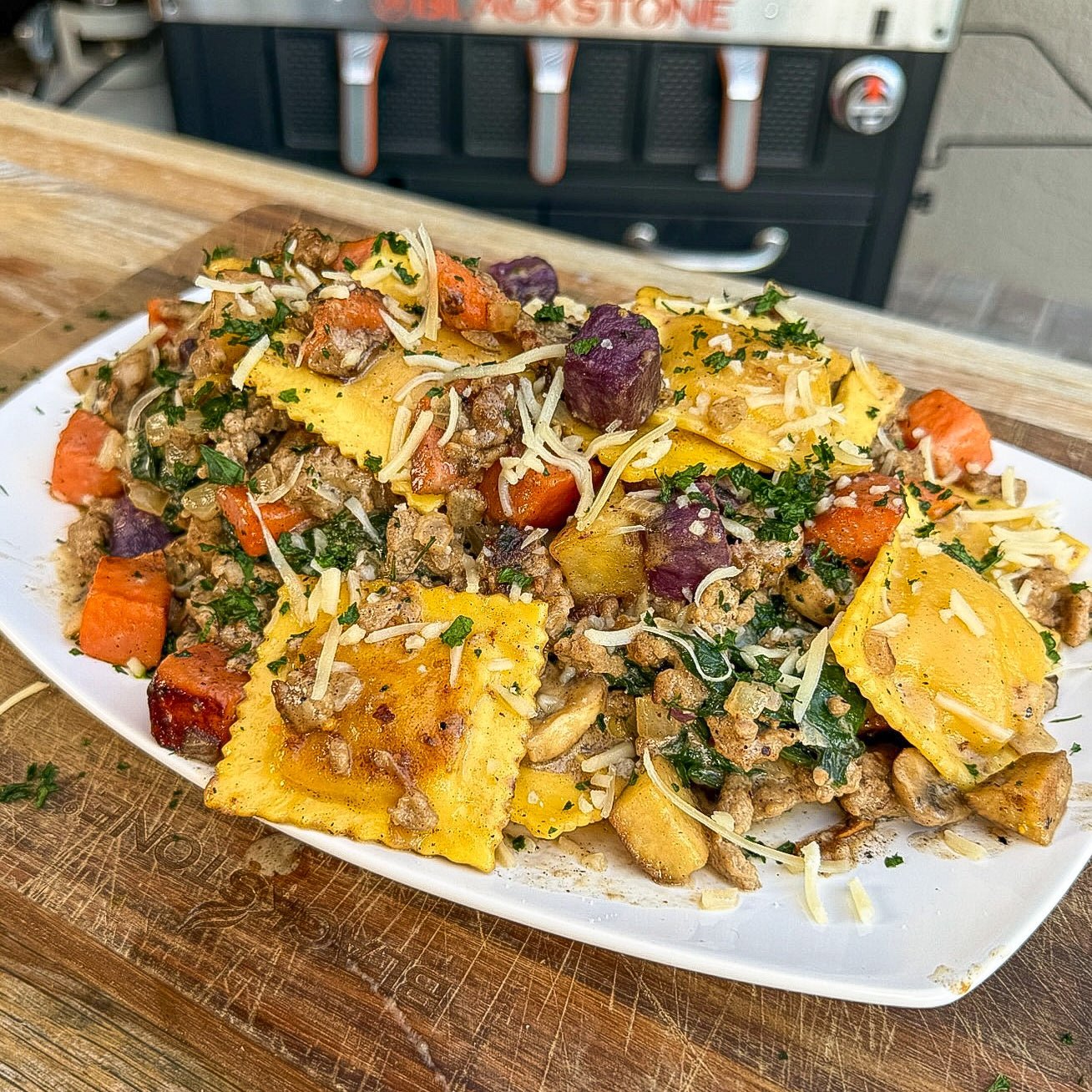 On another section of the griddle over medium-low heat, add the par-boiled ravioli and pour the coconut milk over them. Add the spinach and a handful of Parmesan cheese. Mix gently, then fold in the turkey–vegetable mixture. Toss everything together until coated in the sauce. Add more coconut milk if you prefer a creamier consistency.