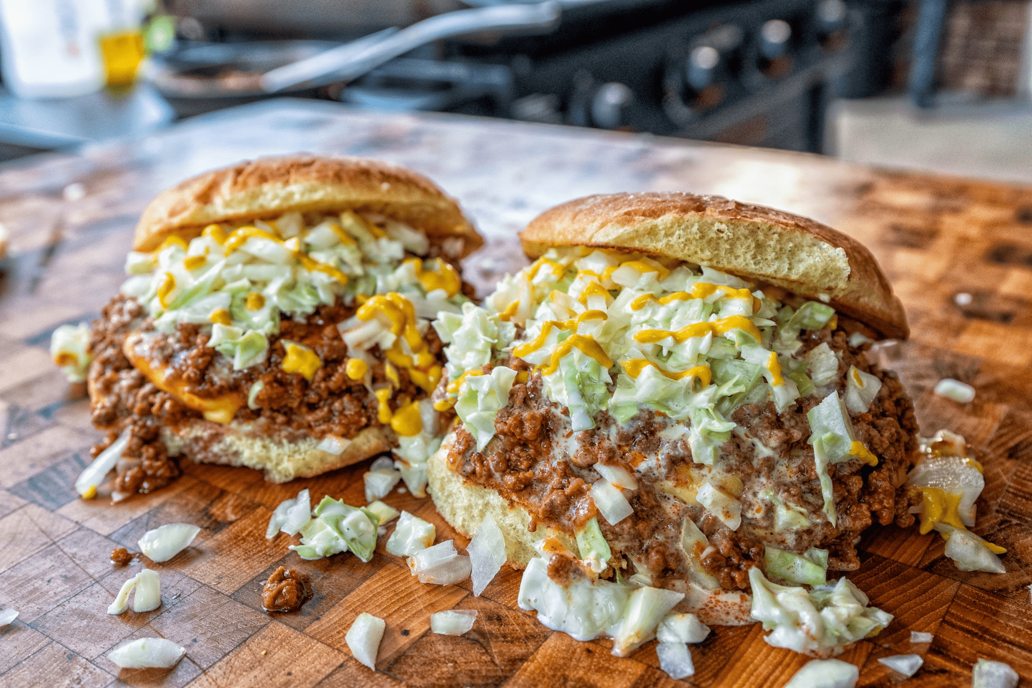 Top the burgers with the prepared chili, slaw, mustard, and chopped onions.