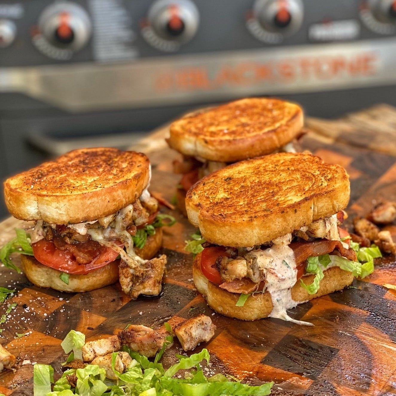 Once the chicken and bacon are done, use some bacon fat to toast the Texas Toast Garlic Bread on the griddle. Ensure it's not swimming in bacon fat, just enough to coat the bottom for a beautiful toast. Remove when both sides are perfectly toasted.