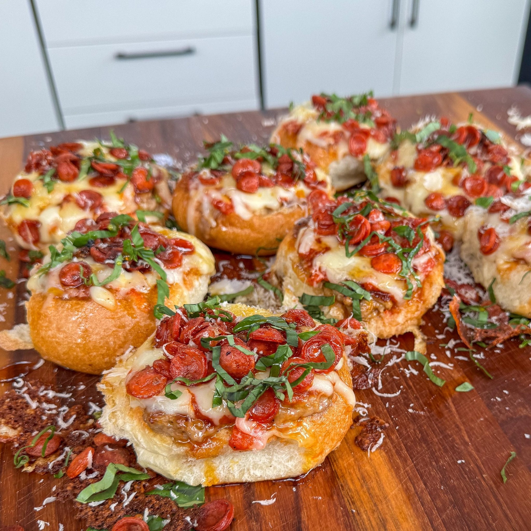 - Once the cheese has melted, plate the rolls and garnish with fresh grated Parmesan, basil, and a drizzle of Mike’s Hot Honey for an extra kick. Enjoy!