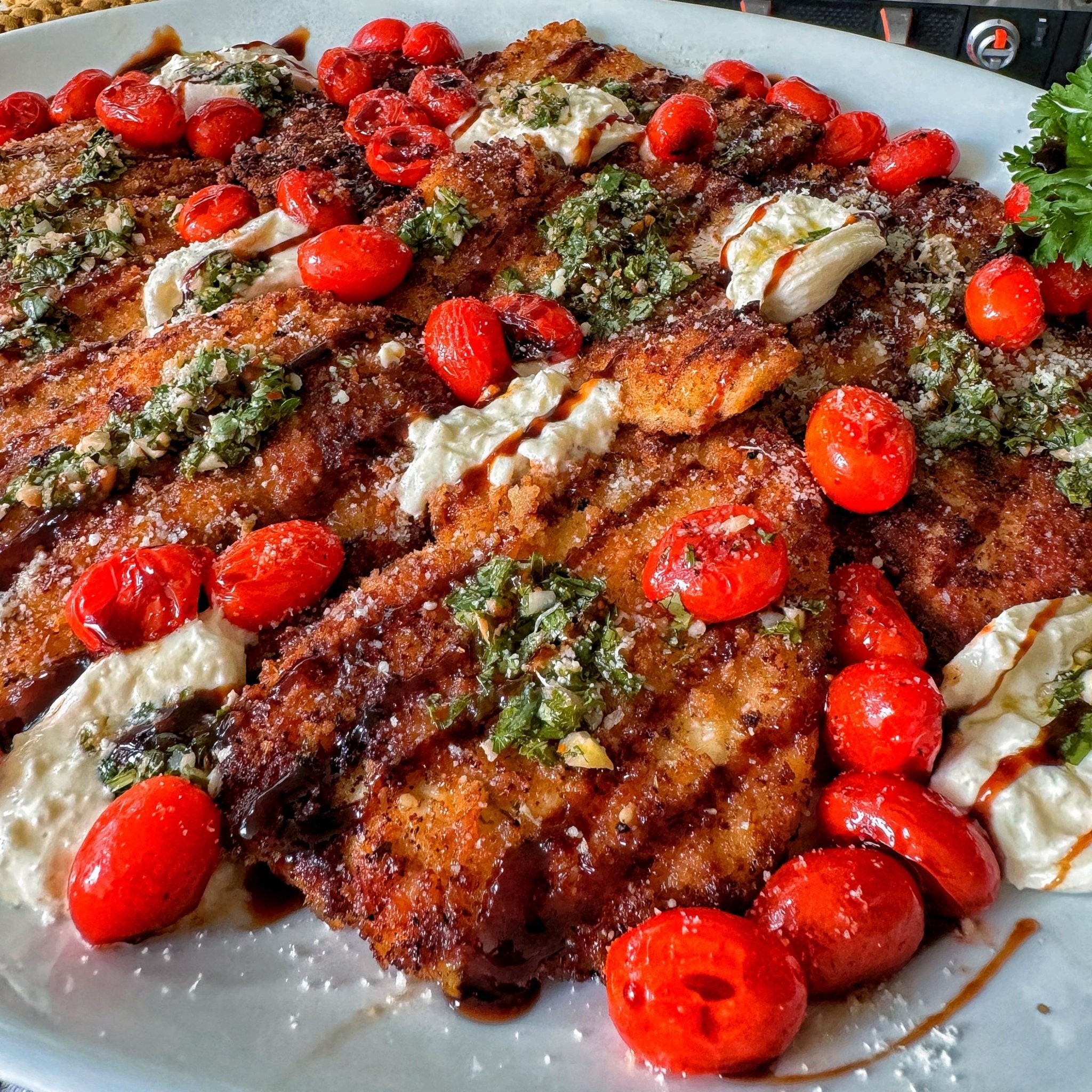 Plate the chicken cutlets and top with basil chimichurri, burrata cheese, and blistered tomatoes. Drizzle with balsamic glaze and enjoy!