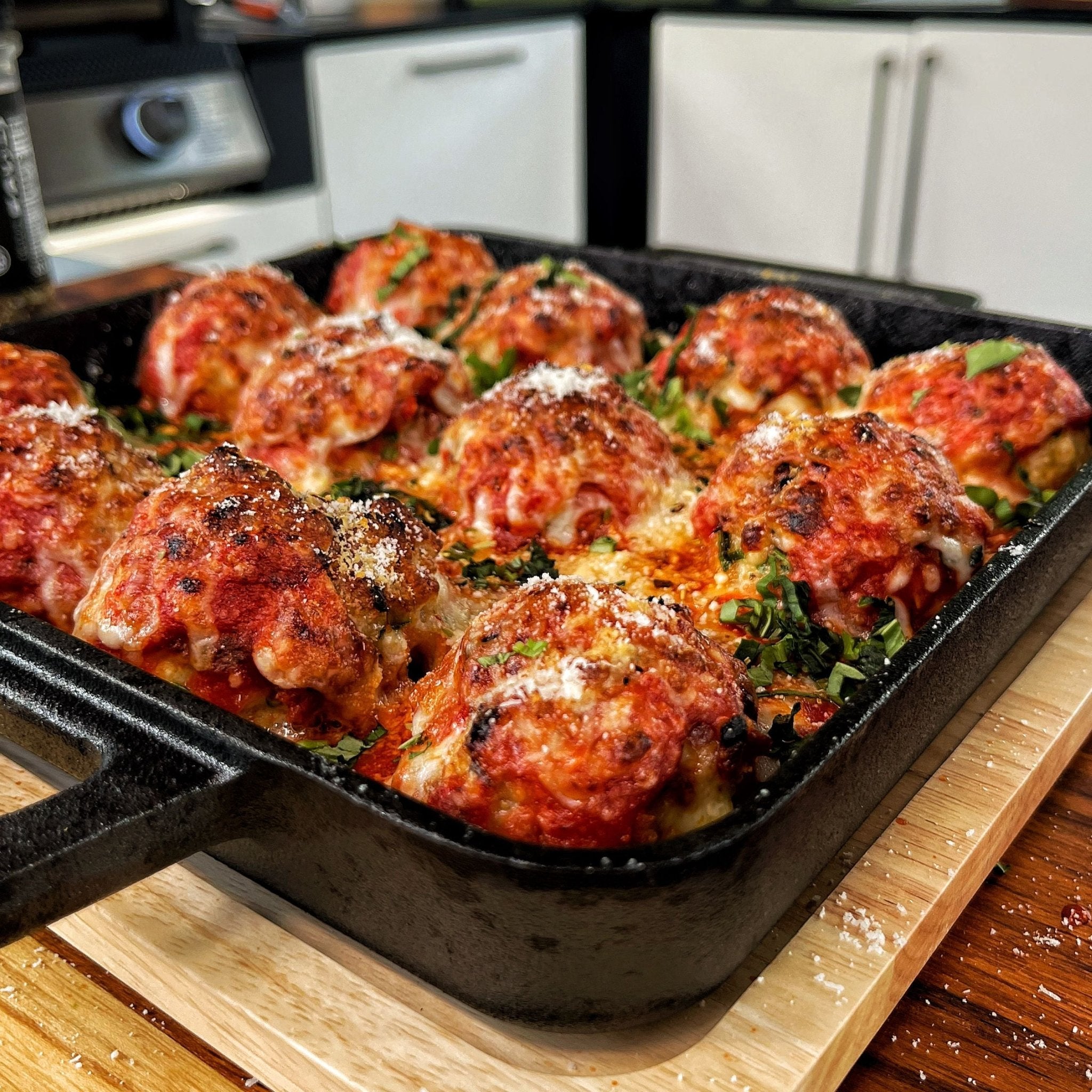 Using your hands, evenly coat your Blackstone Cast Iron Deep Dish with about ¼ cup of olive oil, making sure to cover the bottom and sides. Roll the meat mixture into 12 meatballs and place them in the dish.