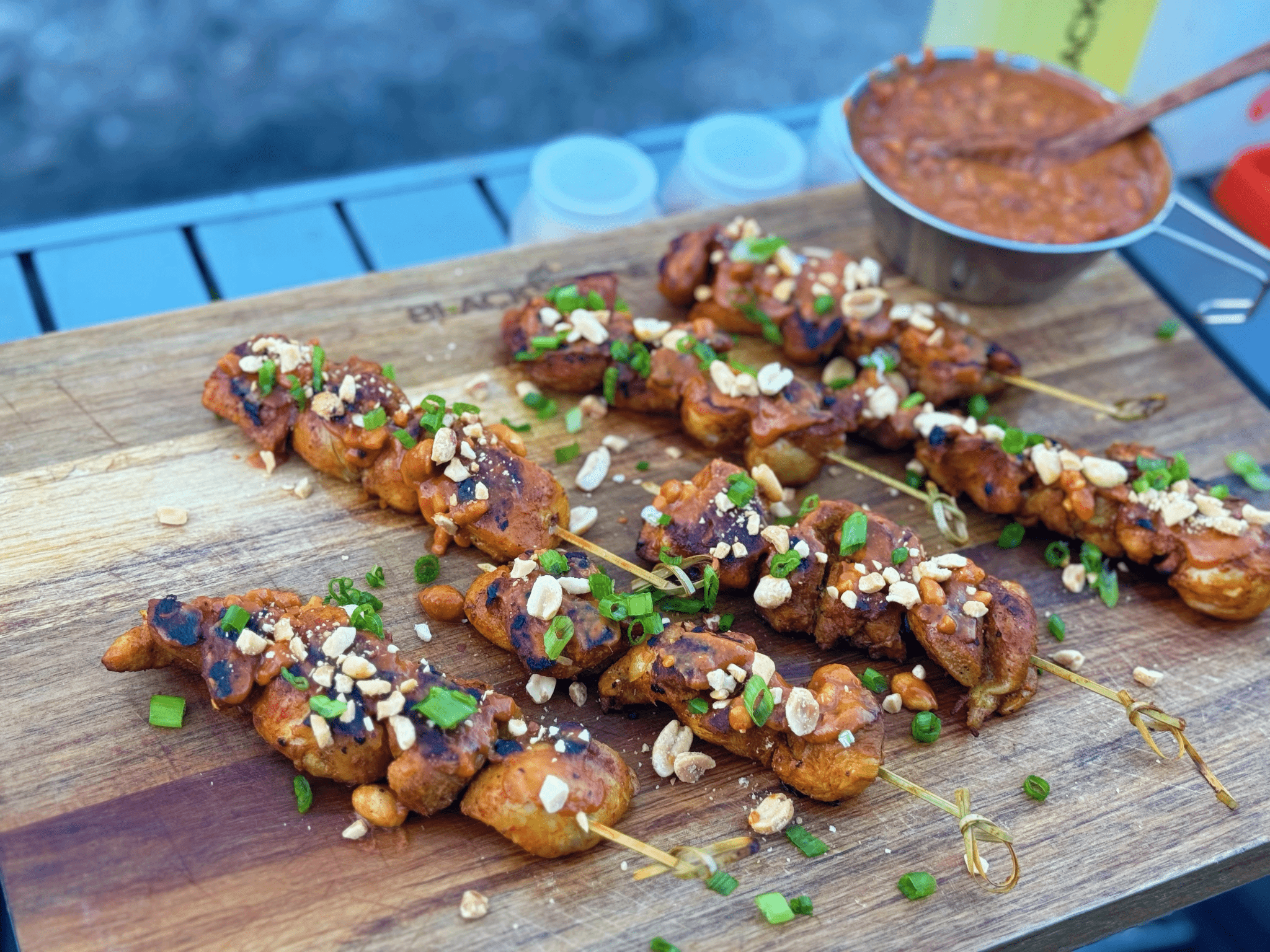 Heat the Blackstone griddle with cooking oil. Carefully lay each chicken skewer on the griddle. Cook for about 4 mins on each side or until the chicken is cooked through. You may want to steam the chicken with a splash of water on the griddle.