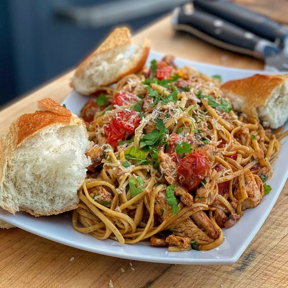 Once the chicken has rested, dice it up and return it to the Blackstone on medium-low heat. Add the blistered tomatoes, cooked linguine pasta, freshly grated Parmesan cheese, juice of one lemon, additional wine if needed, another tablespoon or two of butter, chopped Italian parsley, and a pinch or two of Kosher salt. Mix well.