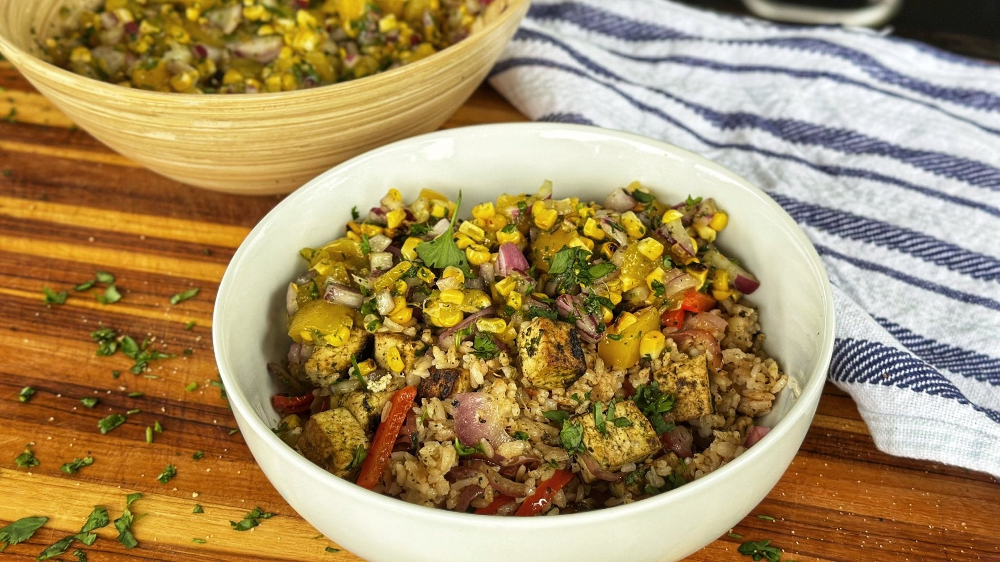 - To serve, scoop the rice and tofu mixture into bowls. Top with charred corn salsa and garnish with extra cilantro if desired. Enjoy!