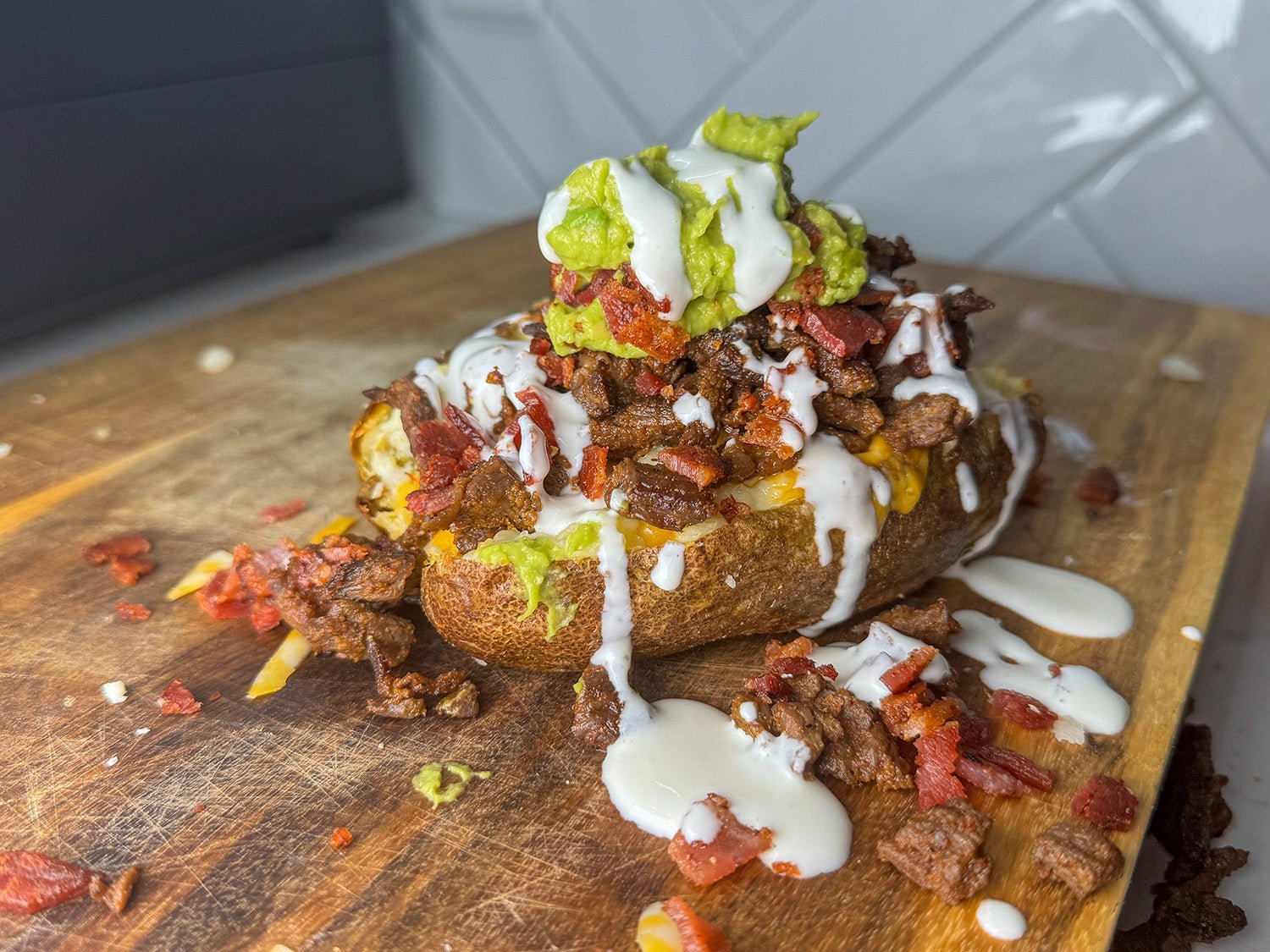 - Poke holes all over each potato with a fork, wrap tightly in foil, and cook in the Blackstone air fryer until tender (about 35–40 minutes, depending on size).