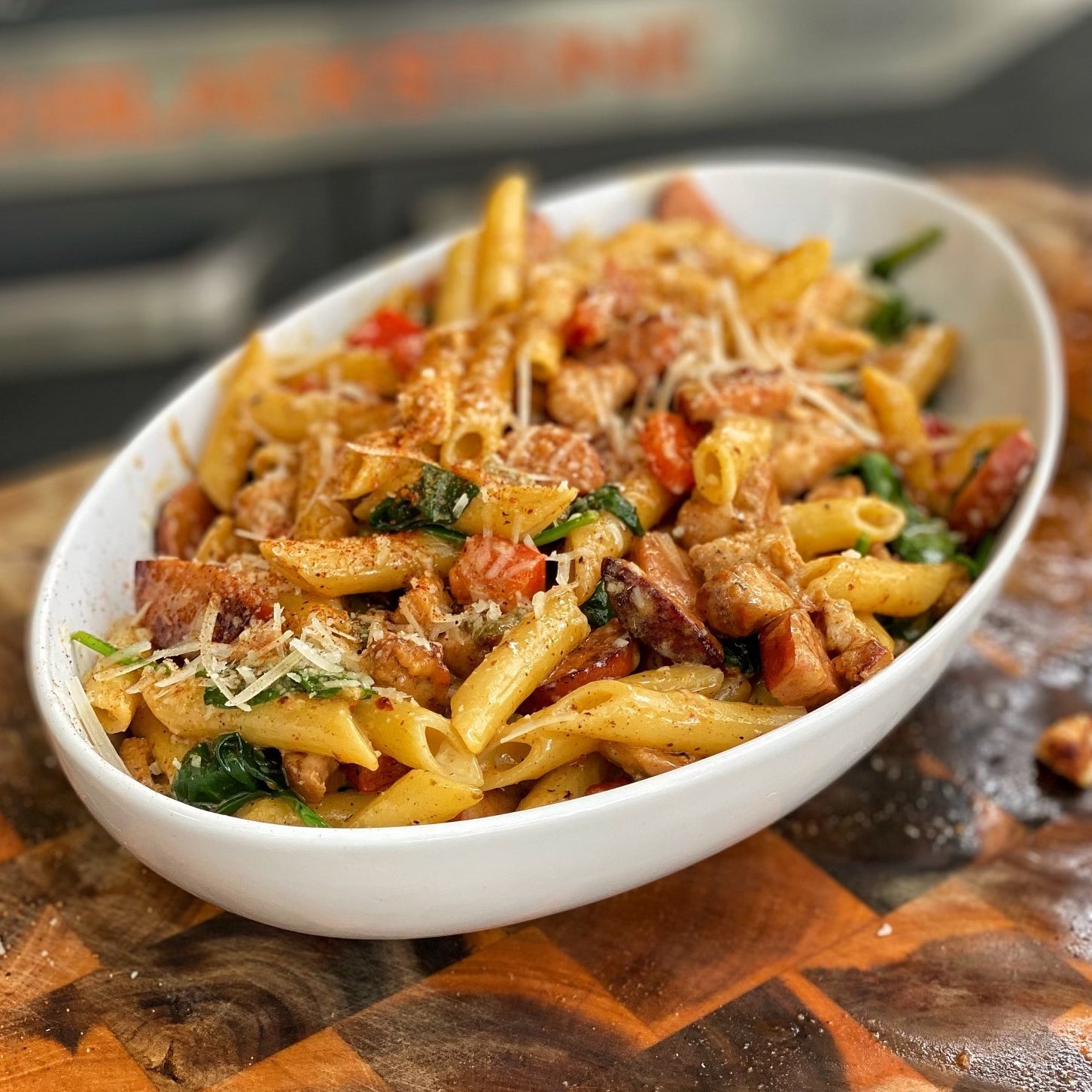 Dice the cooked chicken and add it back to the Blackstone with the bell peppers and sausage. Add 2 teaspoons of minced garlic (fresh garlic is recommended), al dente cooked pasta, half a bag of fresh spinach, 2 to 3 heaping spoonfuls of sun-dried tomatoes, including some of the oil from the sun-dried tomato jar, a quarter cup of fresh Parmesan cheese, 1/3 cup of heavy cream, 1 tablespoon of unsalted butter, and stir to combine all the ingredients. Adjust the Bayou Blend seasoning to taste.