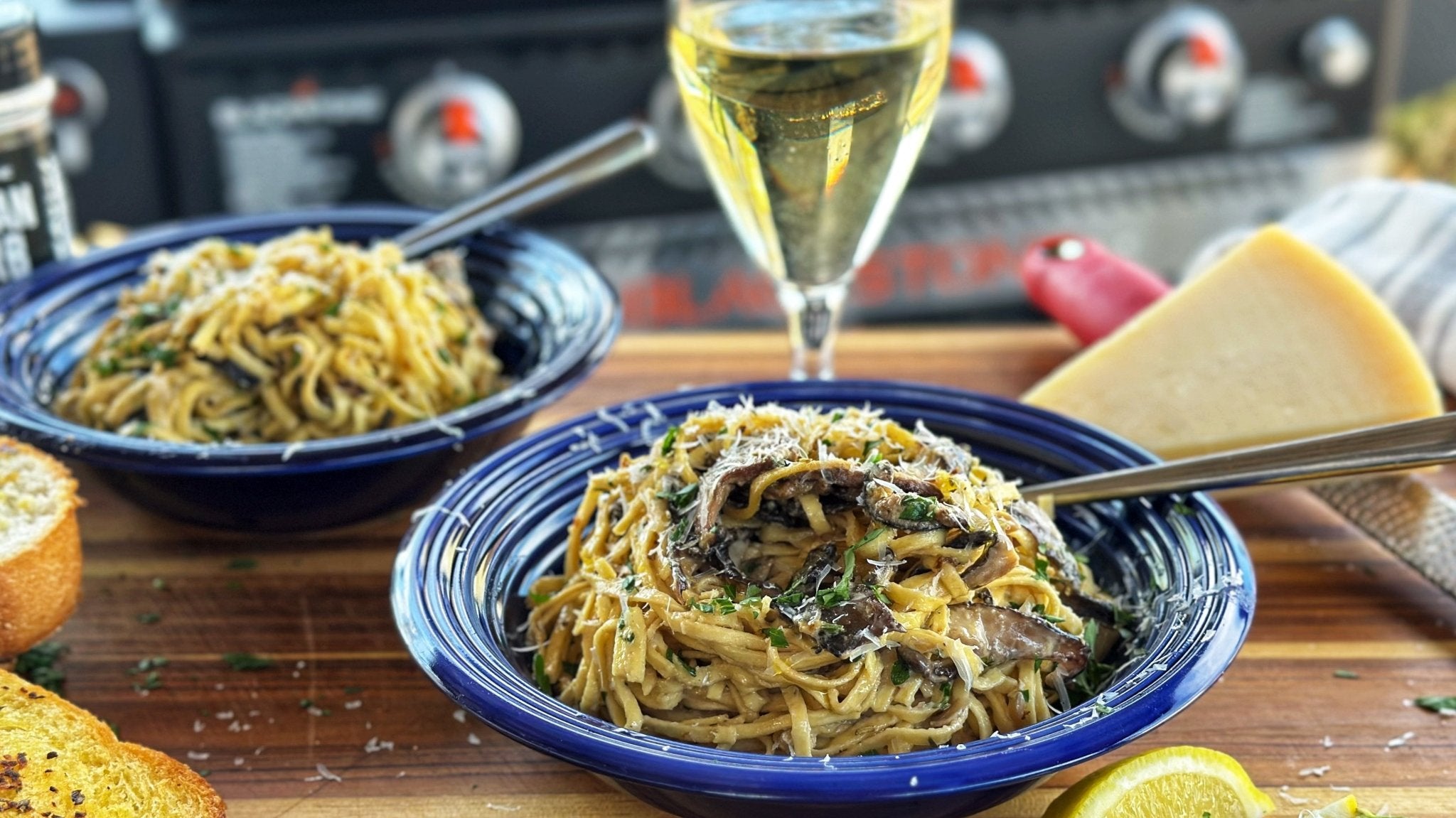 Add 2 tsp olive oil to griddle and saute shallots, garlic, and mushrooms. Once the mushrooms have softened add the wine and Dijon mustard. Allow that to cook down.