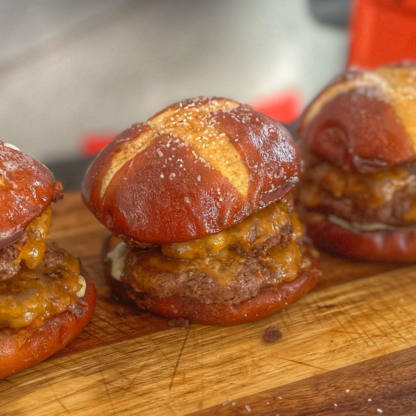 - Assemble the burgers: place two cheeseburger patties on each bottom bun, add mustard as desired, and top with the toasted bun.