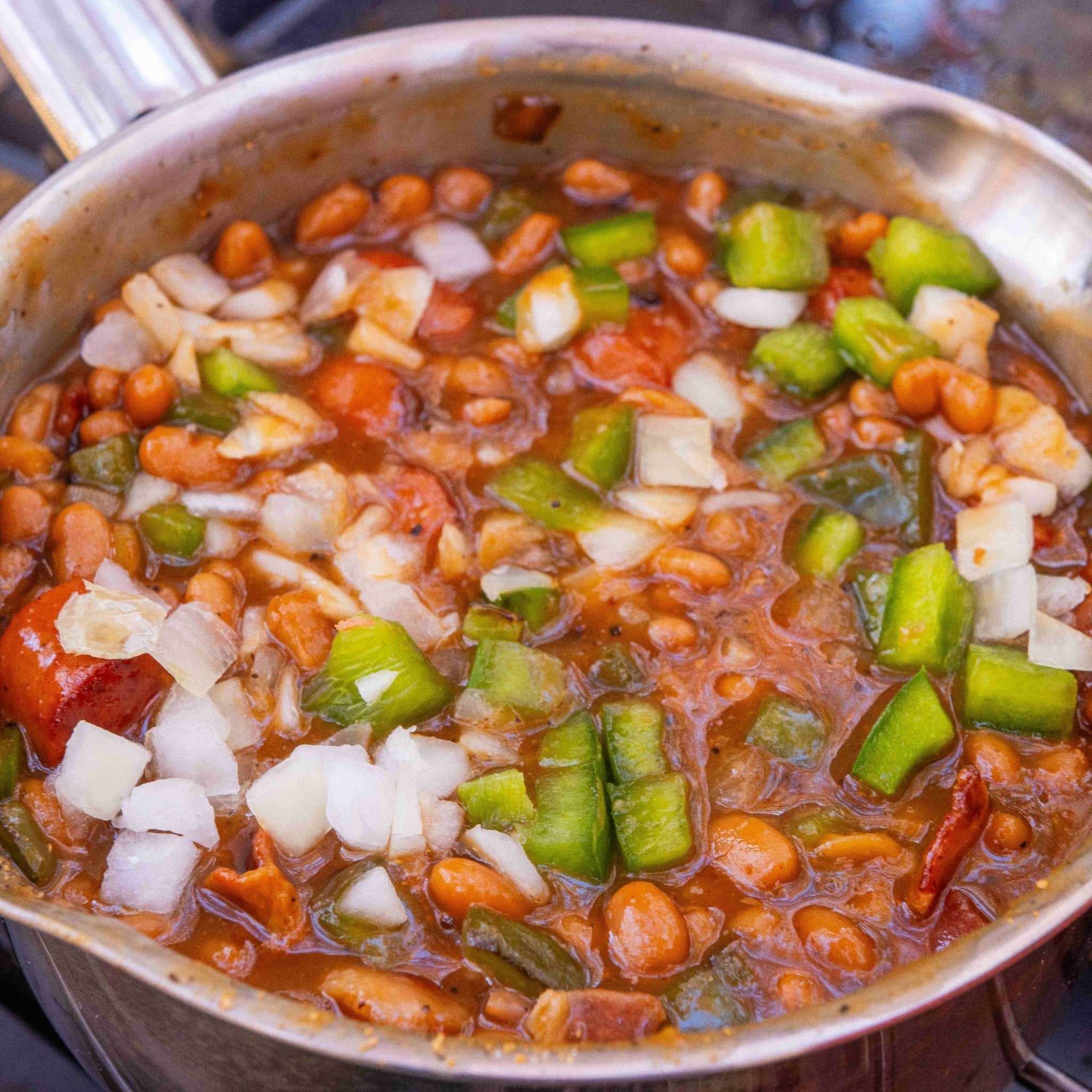 - When the bacon, vegetables, and hot dogs are cooked through, transfer everything into the saucepan of baked beans and stir well.