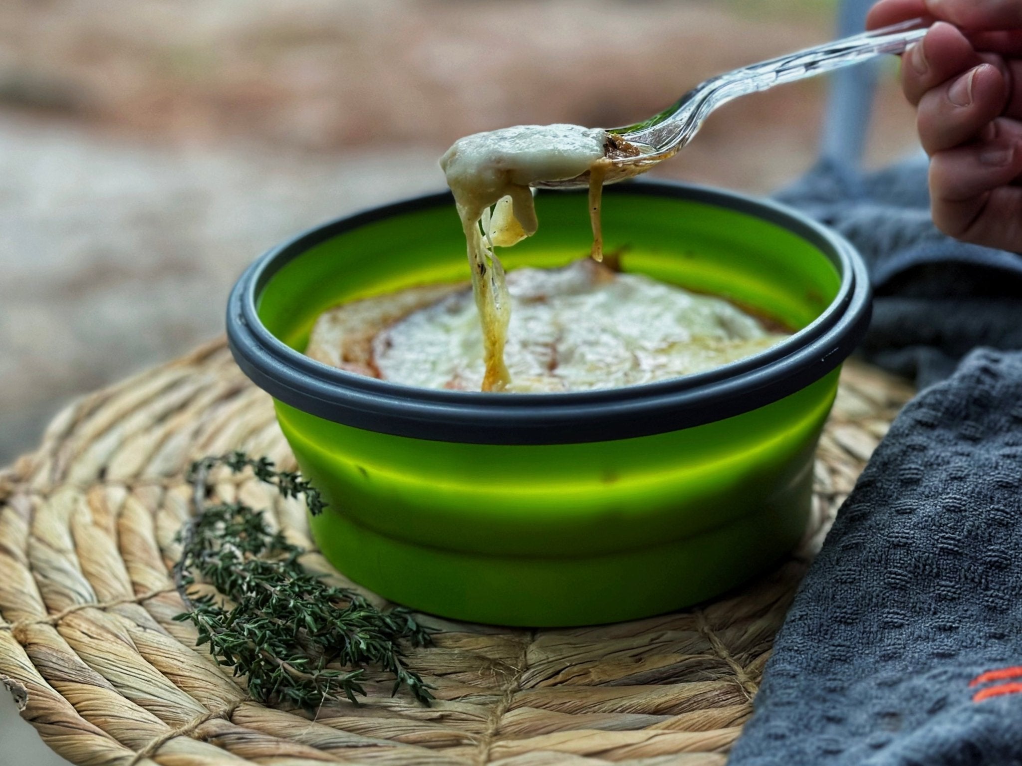 Ladle the soup into your bowl and top it with the toasted bread slices.