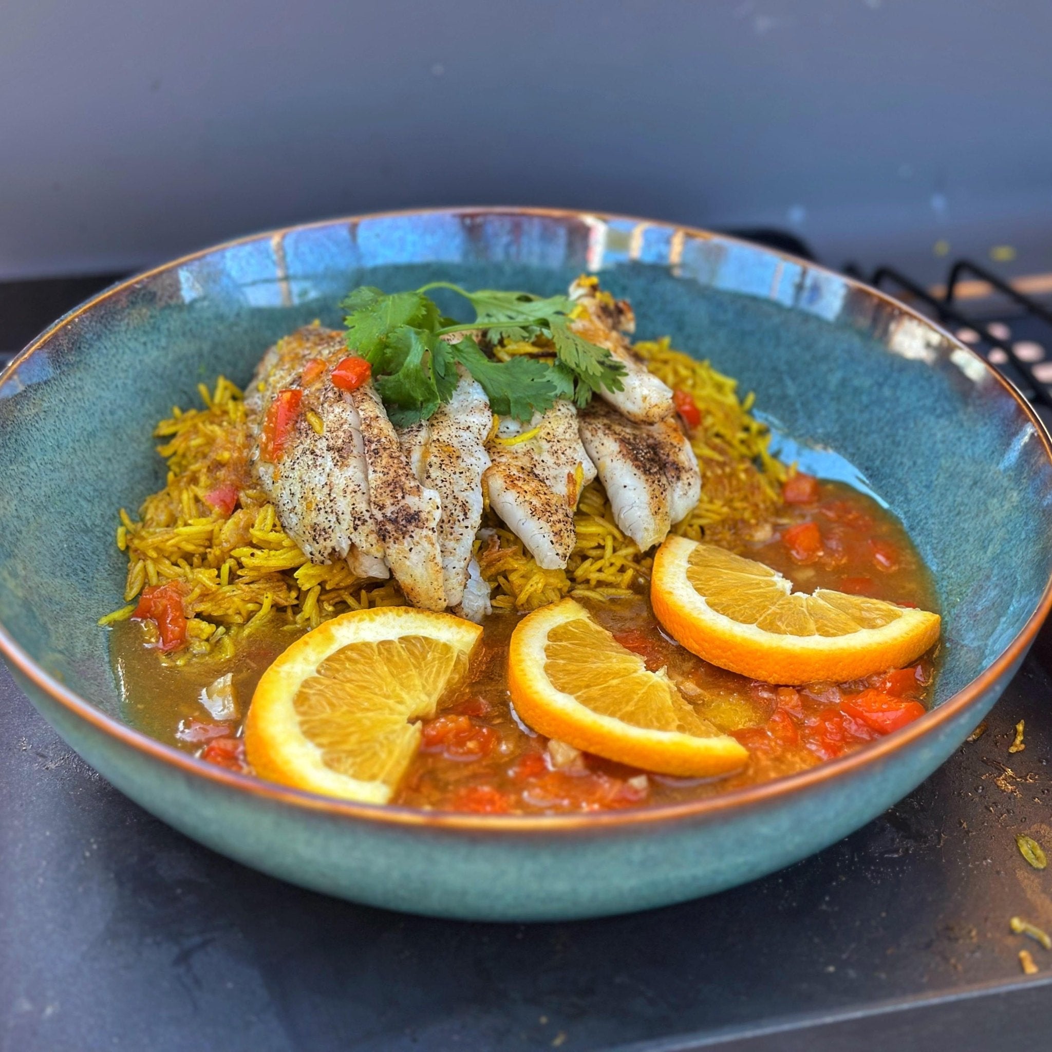 - Once the fish is cooked, remove the rice from the griddle and place it on serving plates. Lay the fish fillets on top of the rice. Spoon the warm orange sauce over the fish to taste. Garnish with fresh cilantro and lemon slices.
