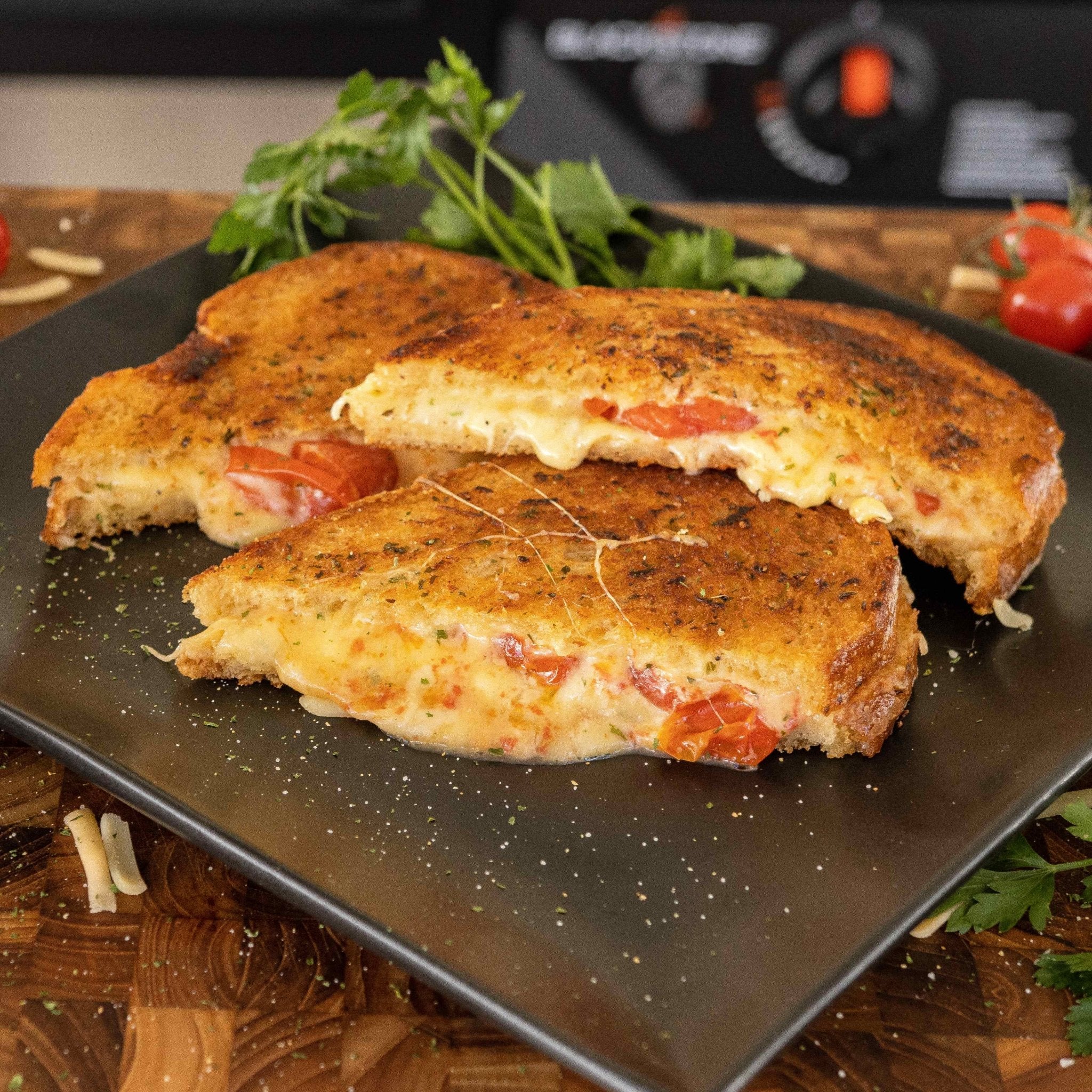 - Once cooked, open each sandwich slightly and spoon in some of the tomato confit. Close the sandwiches, slice, and serve immediately.