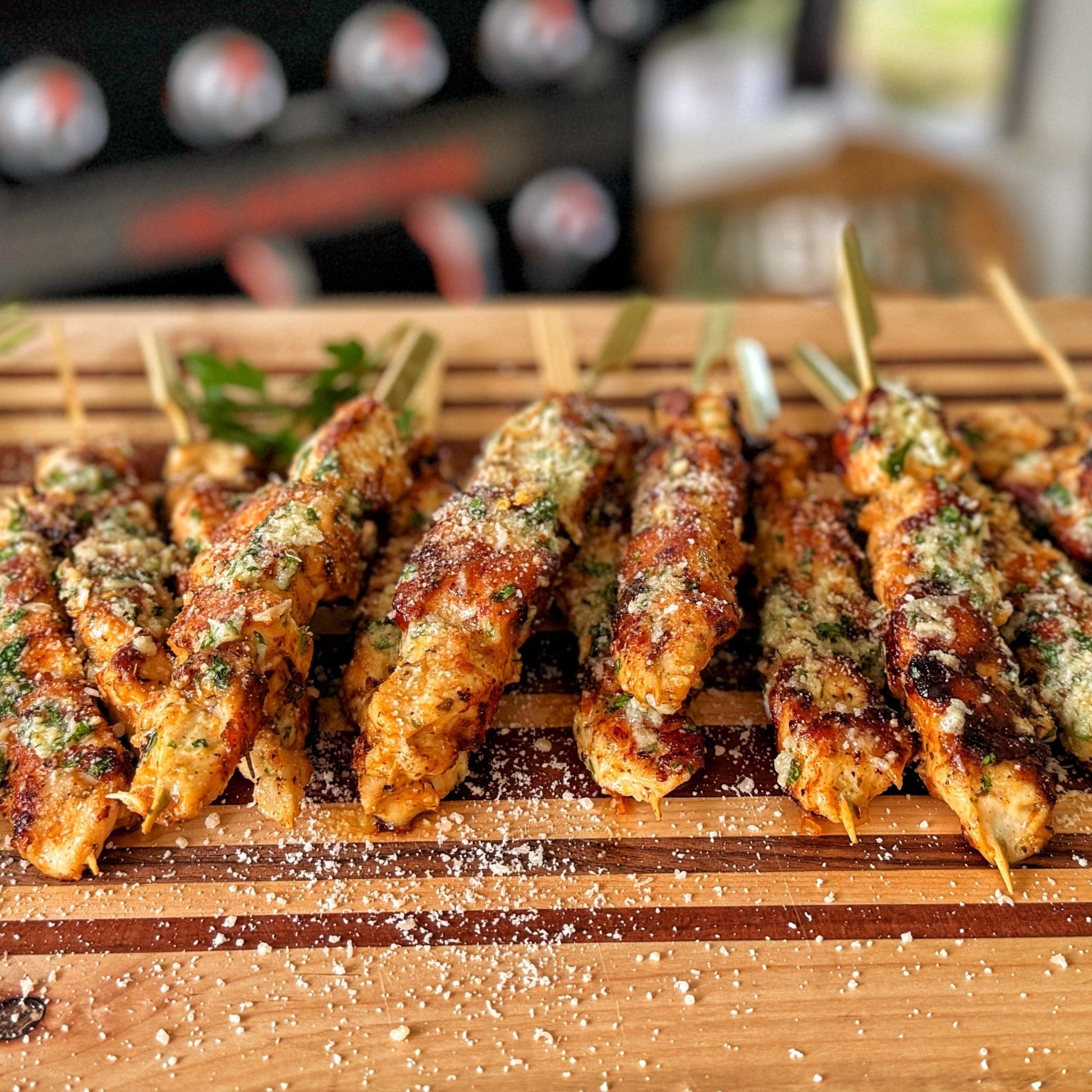 While the chicken is cooking, mix the garlic butter ingredients in a small bowl. In the last couple of minutes of cooking, brush the chicken skewers with the garlic butter on both sides. Plate the skewers, garnish with more Parmesan cheese if desired, and enjoy!