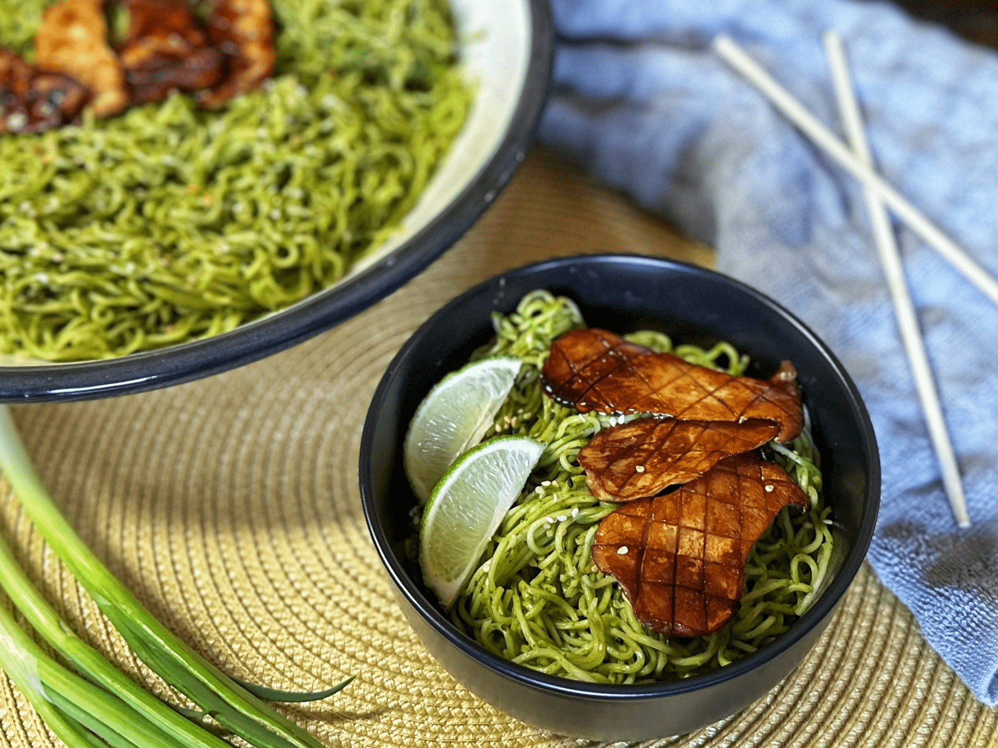 To the blender, add spinach, 2 tbsp soy sauce, juice from 1 lime, and ½ of the reserved pasta water. Blend until smooth.