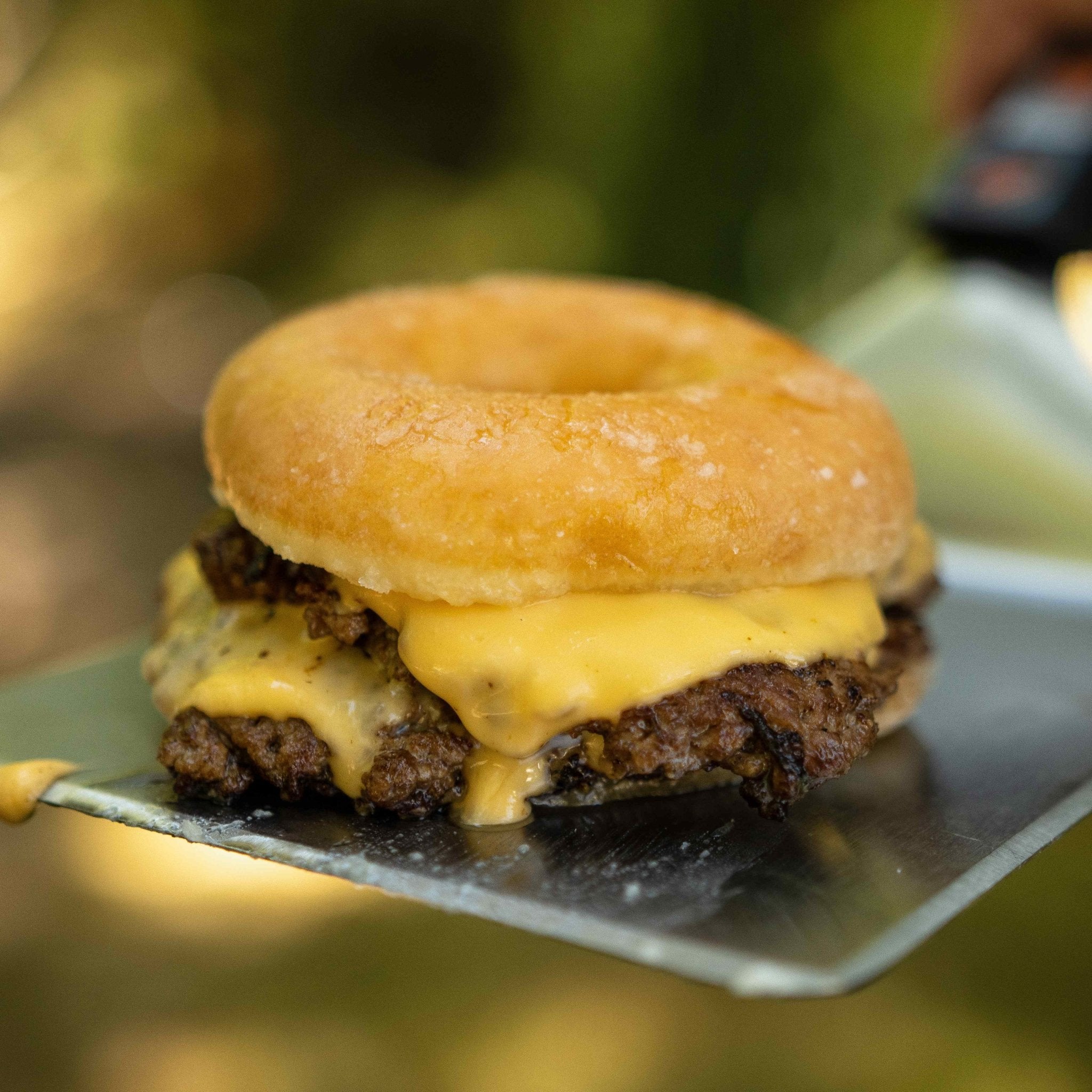 Once the cheese has melted and the burgers are fully cooked, place the patty between the glazed donut halves to create your burger.