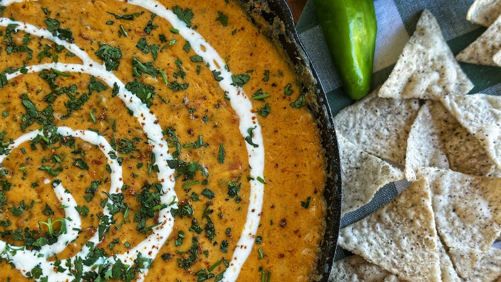 - Remove from the smoker, top with more cilantro and a drizzle of crema, and serve hot with tortilla chips.