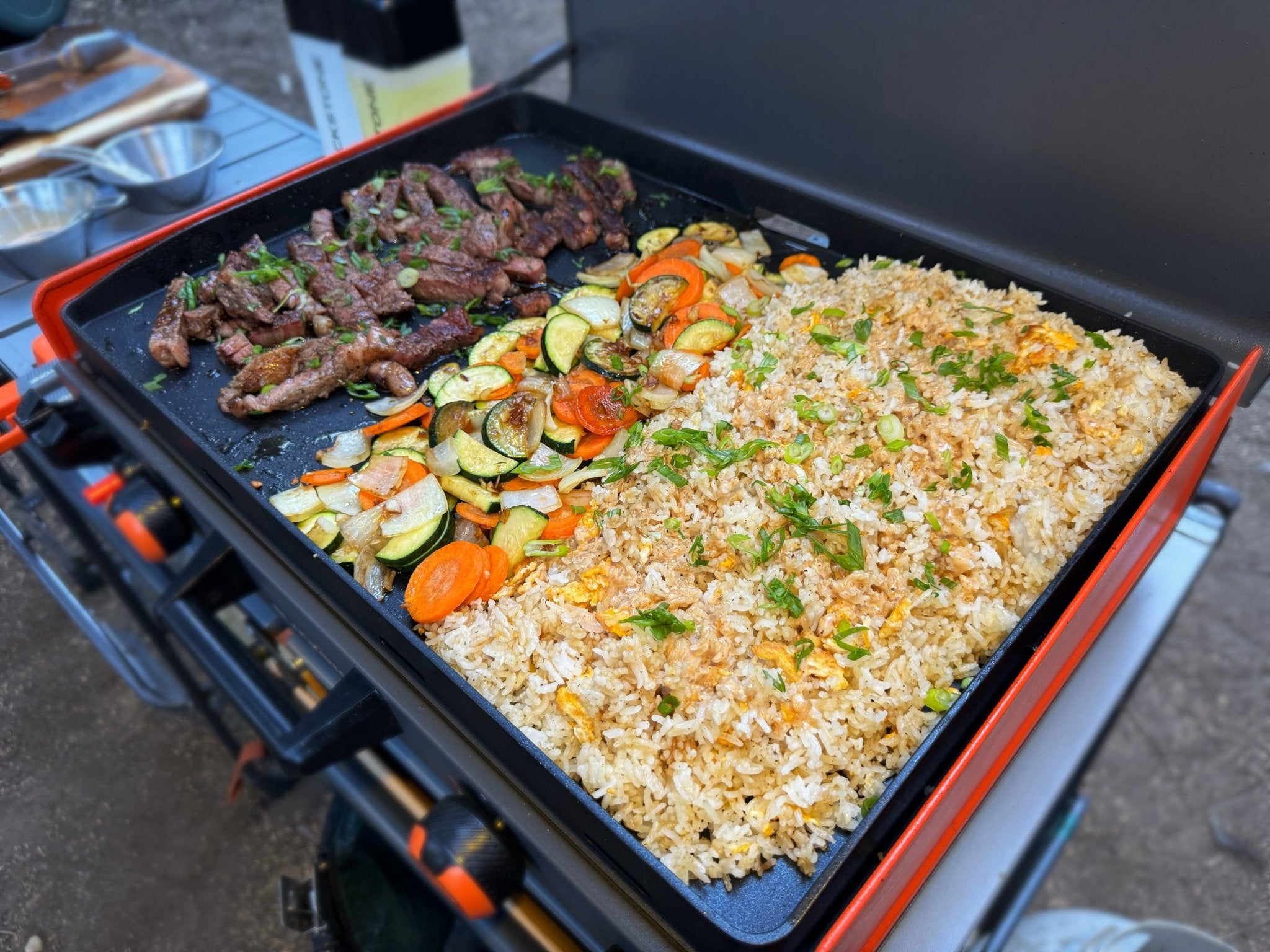 - Season both sides of the ribeye steaks with salt and pepper (about 1-2 tsp total for both steaks). Set aside. Heat a griddle or large skillet over medium-high heat and add a bit of cooking oil. Scramble and cook the eggs until they are about 90% cooked through, then add the cooled rice. Break up the rice with a spatula and season it with soy sauce, sesame oil, black pepper, and a splash of water if needed to steam the rice. Cook for 5-6 minutes or until the rice is heated through and evenly coated. Set the rice aside on one side of the griddle.