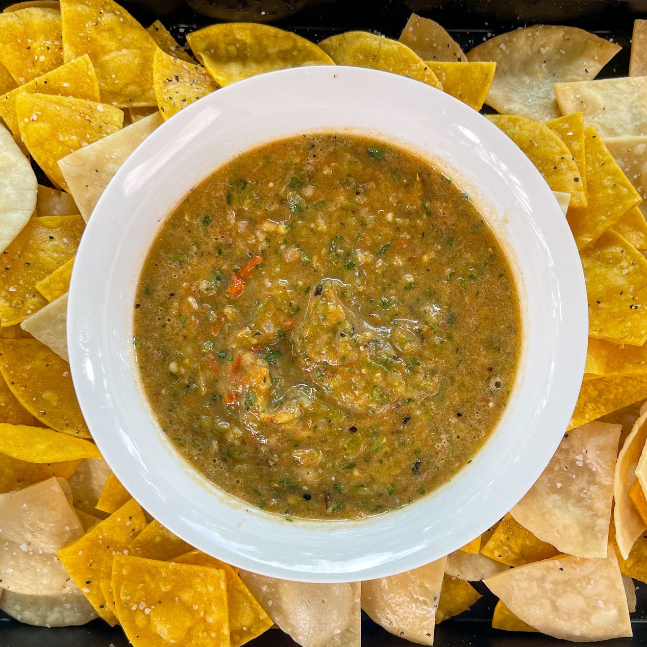 On a pizza tray or similar, place all vegetables, halved lime, and garlic cloves (remove tomatillo husks and slice lime). Drizzle lightly with olive oil and season with Blackstone S.P.G. (Do not roast cilantro.)