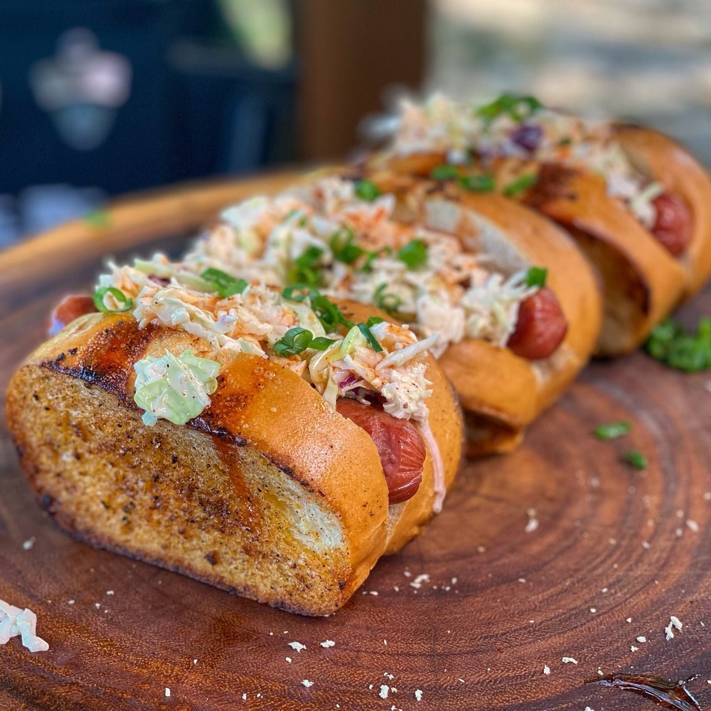 Place a hot dog in each bun. Top with coleslaw and drizzle with the hot honey sauce. Sprinkle diced green onions on top and enjoy!