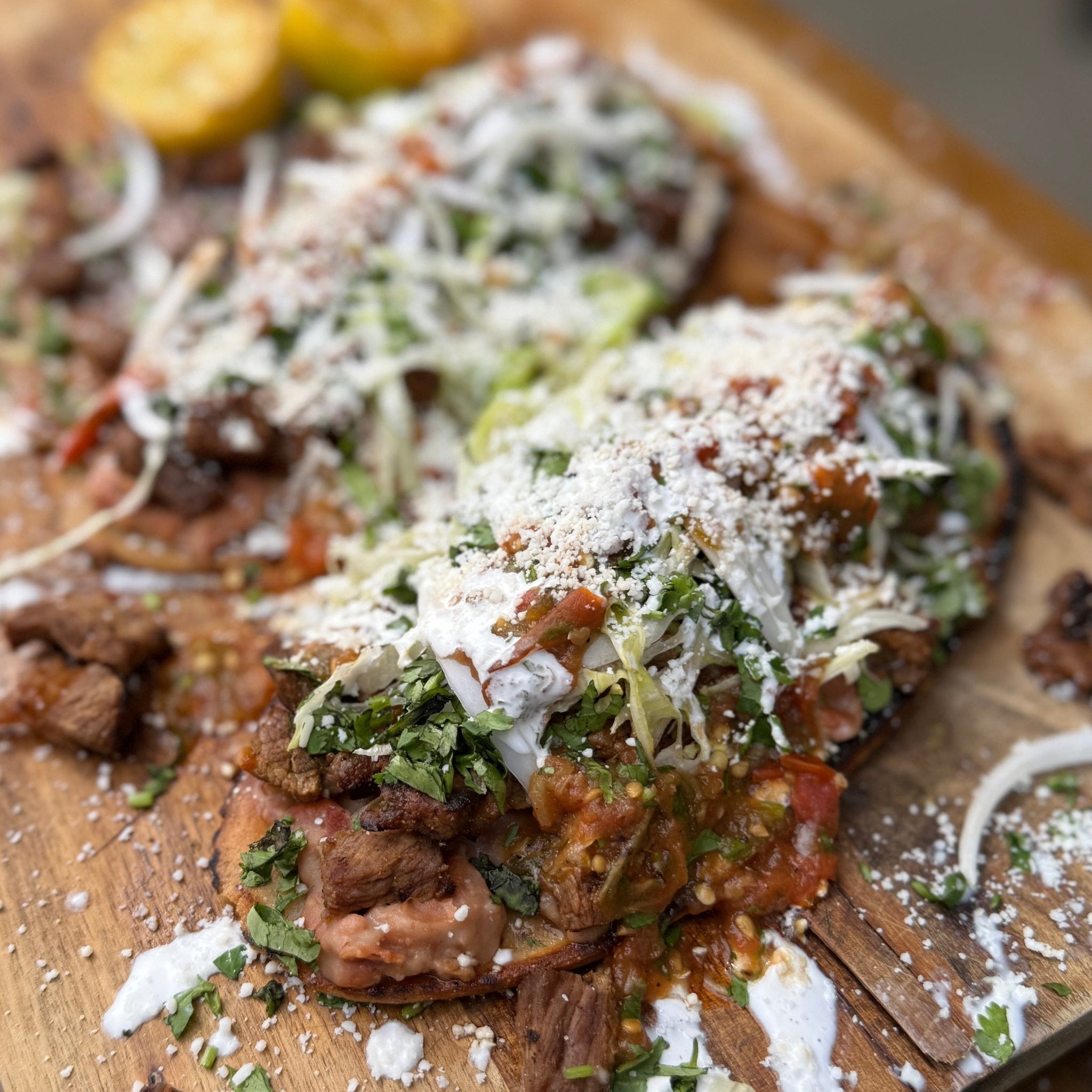 - To assemble, spread refried beans over each huarache. Top with chopped asada, shredded lettuce, diced white onion, salsa molcajete, a drizzle of sour cream, and crumbled queso cotija. Garnish with cilantro if desired and serve immediately.