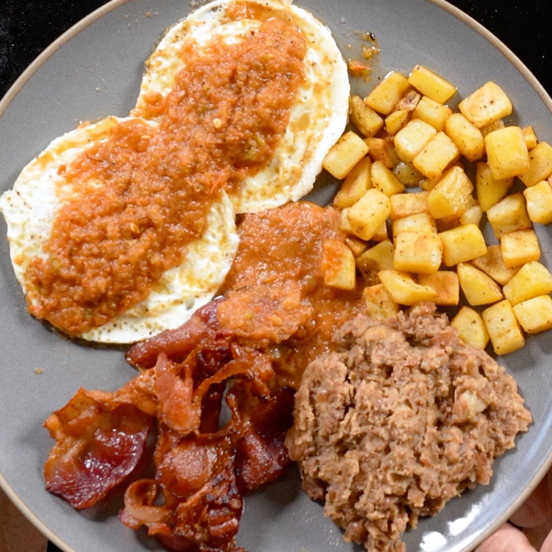 - On each plate, layer a tortilla with a portion of pinto beans, two fried eggs, and a spoonful of salsa. Serve with crispy bacon, a side of potatoes, and additional salsa on the eggs if desired.