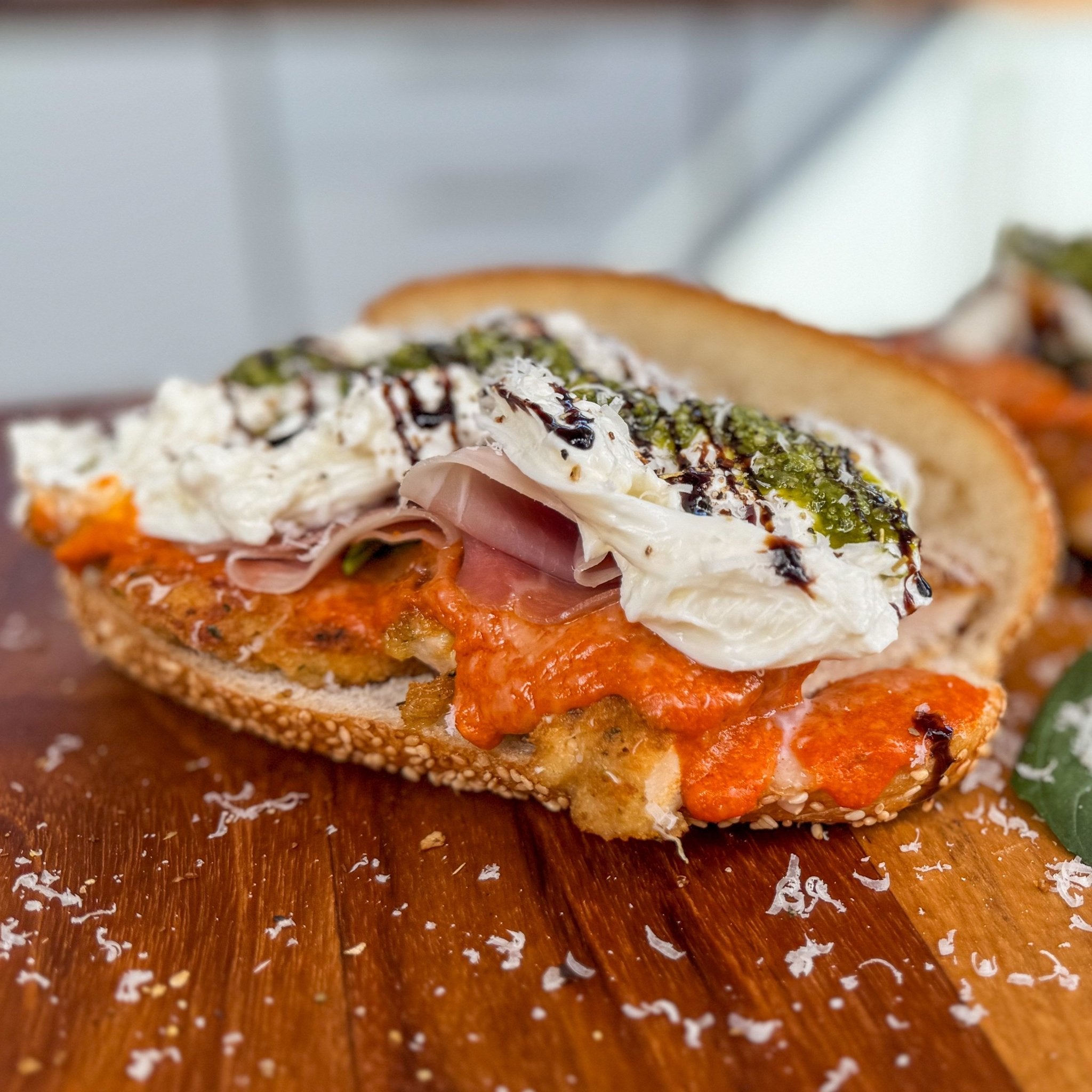 - Once toasted, layer each sandwich with fresh basil, prosciutto, torn burrata cheese, pesto, and a drizzle of balsamic glaze. Serve and enjoy!