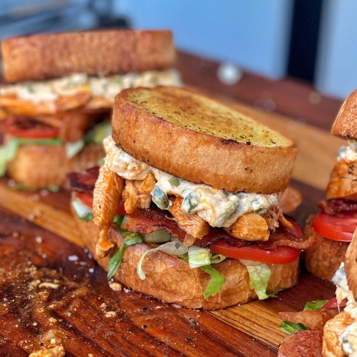 - Spread a generous layer of the jalapeño cream cheese mixture on one side of each slice of Texas Toast. On two of the slices, layer a chicken cutlet, two slices of crispy bacon, a few romaine lettuce leaves, and one or two tomato slices. Drizzle additional Buffalo sauce over the chicken and bacon if you prefer extra heat. Top with the remaining slices of Texas Toast (cream cheese side down).