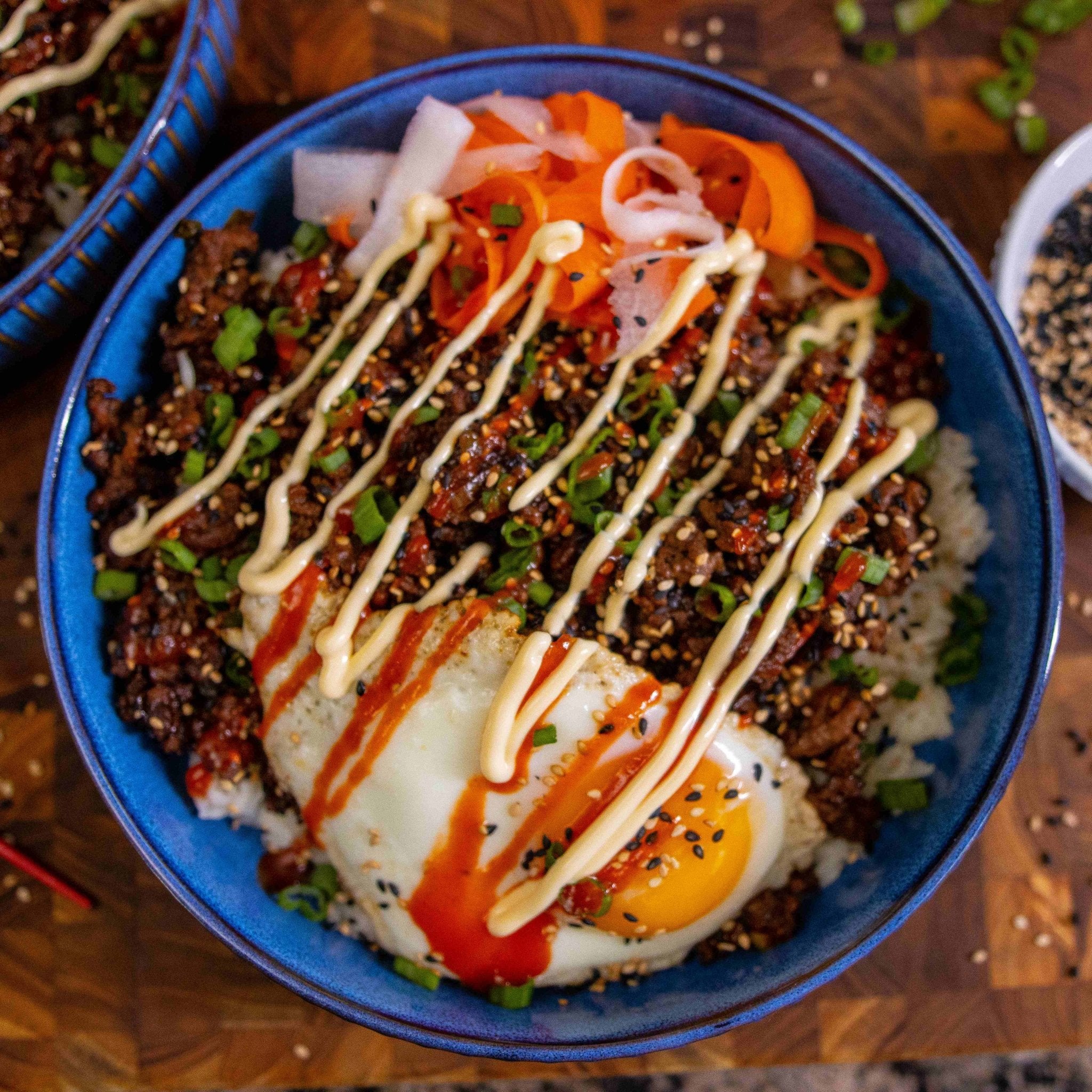 - Serve the cooked beef over a bed of white rice. Top each bowl with a sunny-side-up egg, the green parts of the sliced green onions, extra toasted sesame seeds, and the pickled veggies. For an extra touch, drizzle with Kewpie mayo and/or sriracha, if desired.
