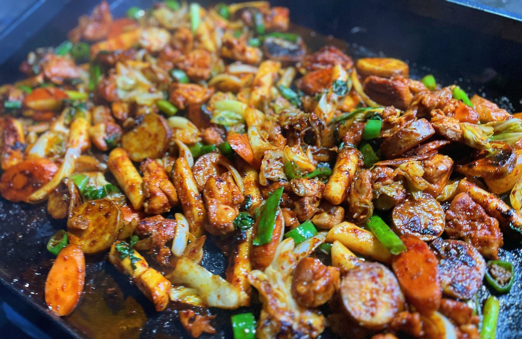 Once the carrots and sweet potatoes are tender, move them to one side of the griddle and reduce the heat. On the other side of the griddle, cook the marinated chicken along with rice cakes and cabbage under a cooking dome for 10-12 minutes or until the chicken is fully cooked, and the rice cakes are soft and plump.