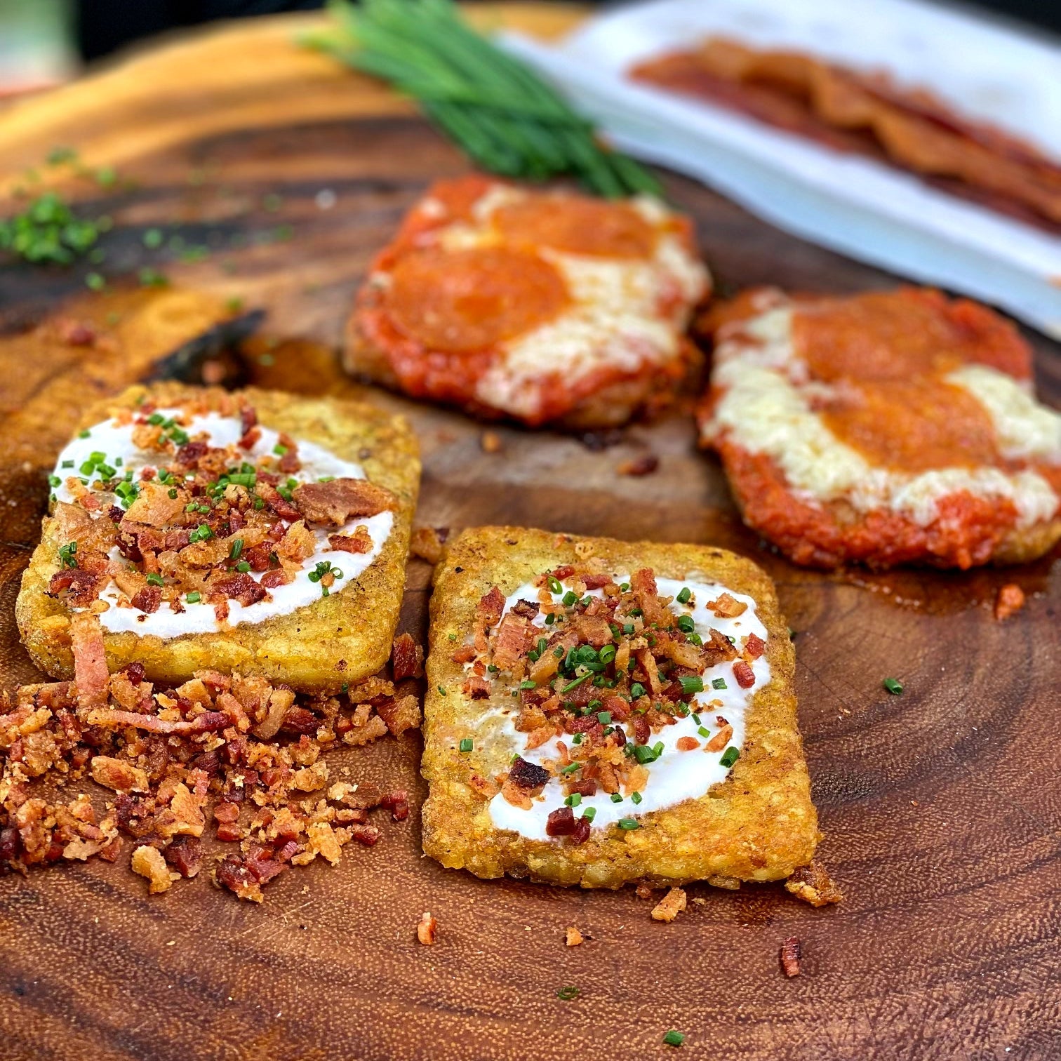 For the pizza-style hashbrowns, spread a little pizza sauce on top of each hashbrown, sprinkle mozzarella cheese, and top with two slices of pepperoni. Return the hashbrowns to the griddle and cover with a dome to melt the cheese, about 2 minutes.