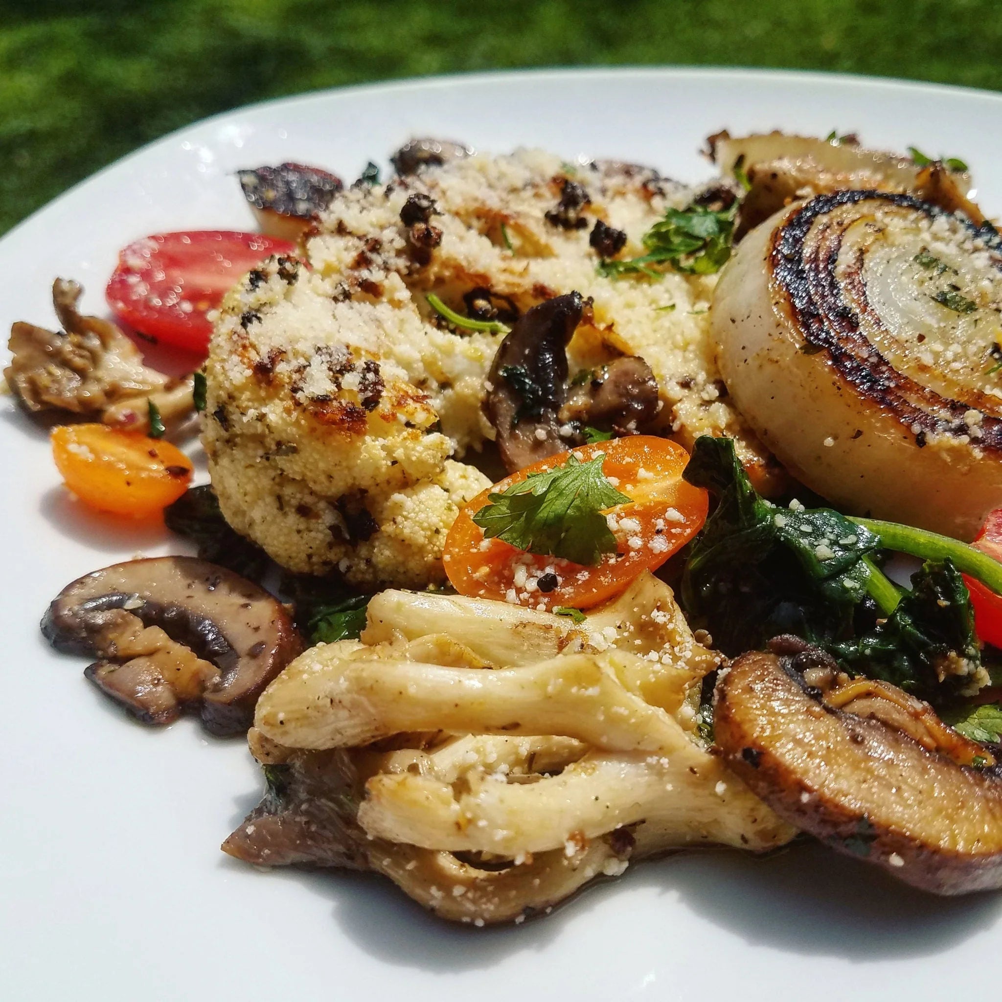 Turn your Blackstone griddle to medium high heat. Spread a tablespoon of butter on the hot griddle, add your cauliflower. Let cook 5 minutes. Flip and using a basting dome to steam for 3 minutes, then let cook uncovered for 4-5 more minutes or until cooked through. Use a toothpick to check for doneness to your liking. Set aside and top with cheese to melt.
