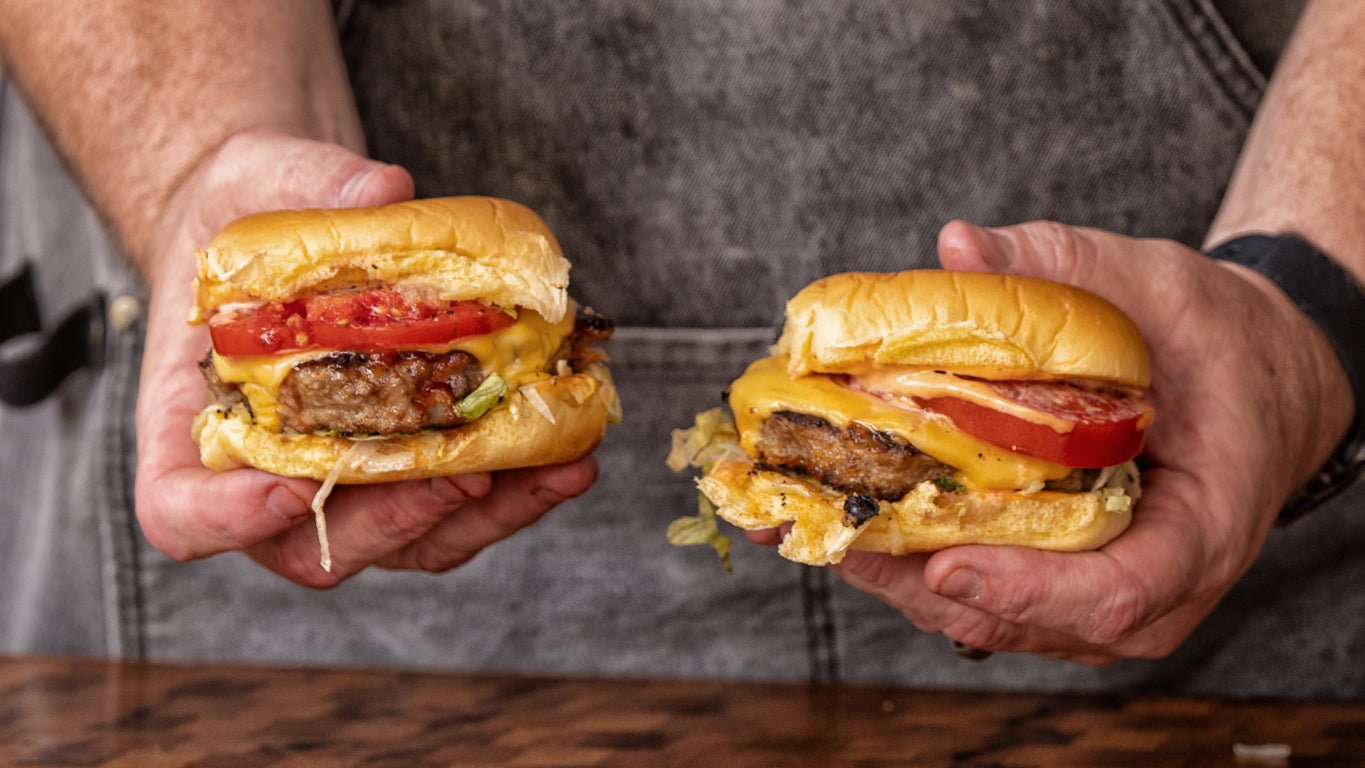 Remove the burgers and the buns from the griddle and build by adding sriracha mayo to each side of the bun, then lettuce to the bottoms, adding the burger patty, then topping with tomato. Salt and pepper the tomato.