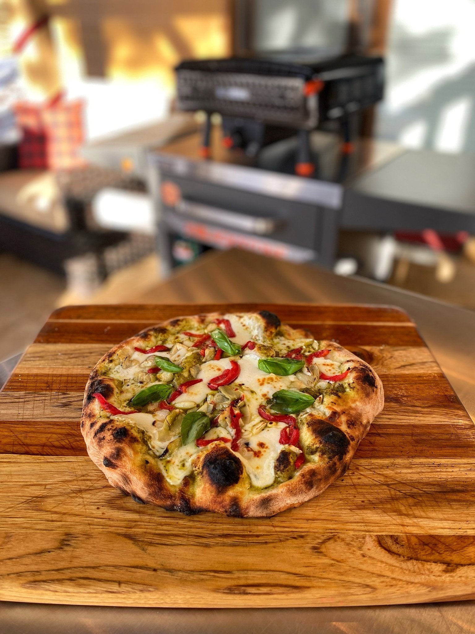 Bake in the pizza oven until the cheese is melted, and the crust is golden brown and crispy. Monitor closely, as cooking time may vary.