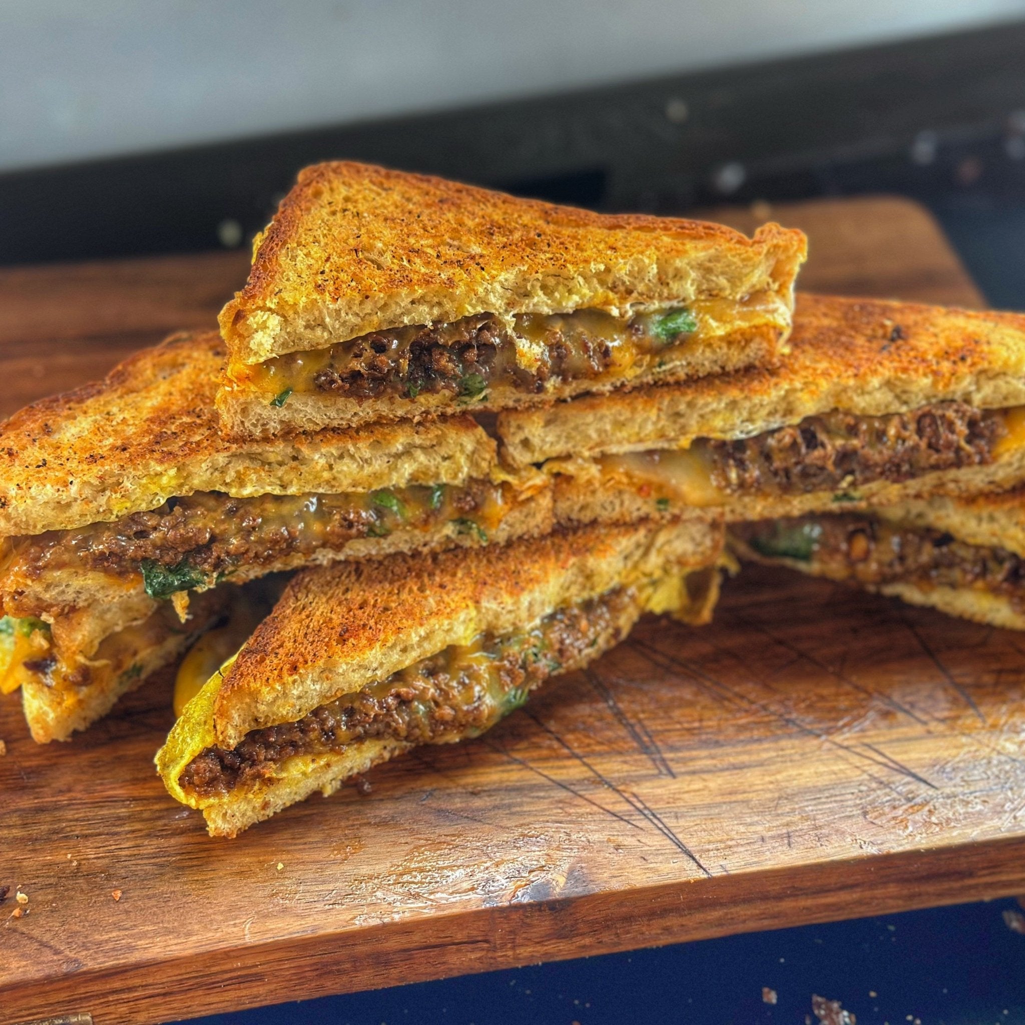 Flip each sandwich together and let them sit on the heat a bit longer to melt the cheese. You can add water to the griddle top and close the hood to help with melting.