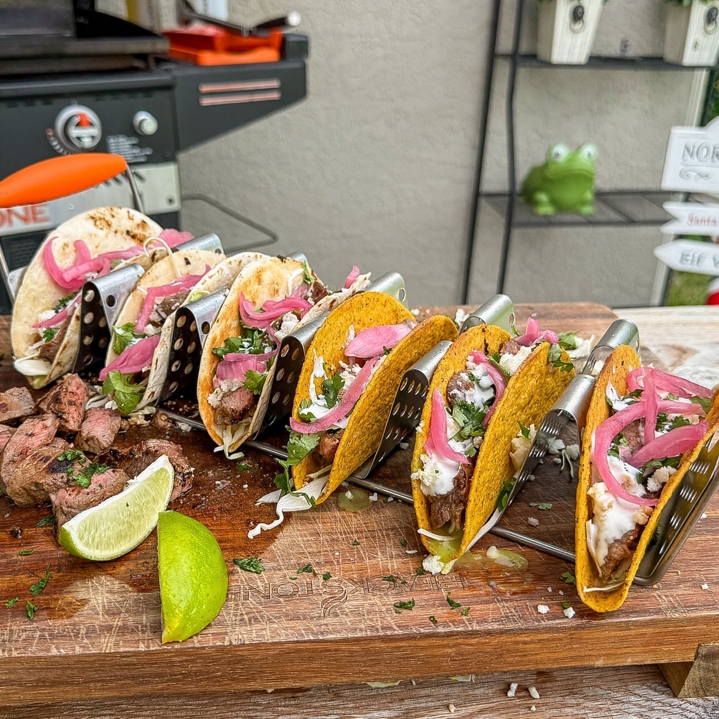 Spread 1 teaspoon guacamole salsa in the bottom of each shell. Add a layer of shredded cabbage. Add 3–4 pieces of steak. Top with queso fresco, cilantro, and crema.