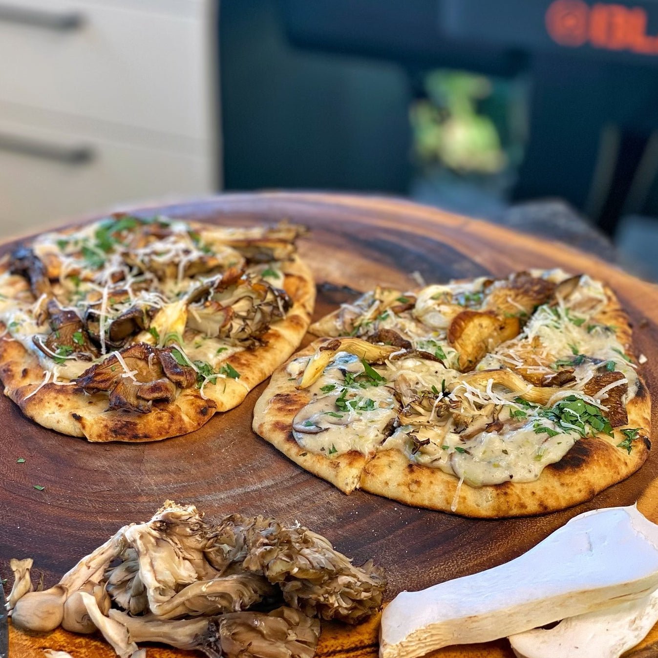 Spoon the mushroom sauce evenly onto the flatbread, then top with the caramelized mushrooms. Garnish with chopped parsley and Grana Padano. Slice and serve.